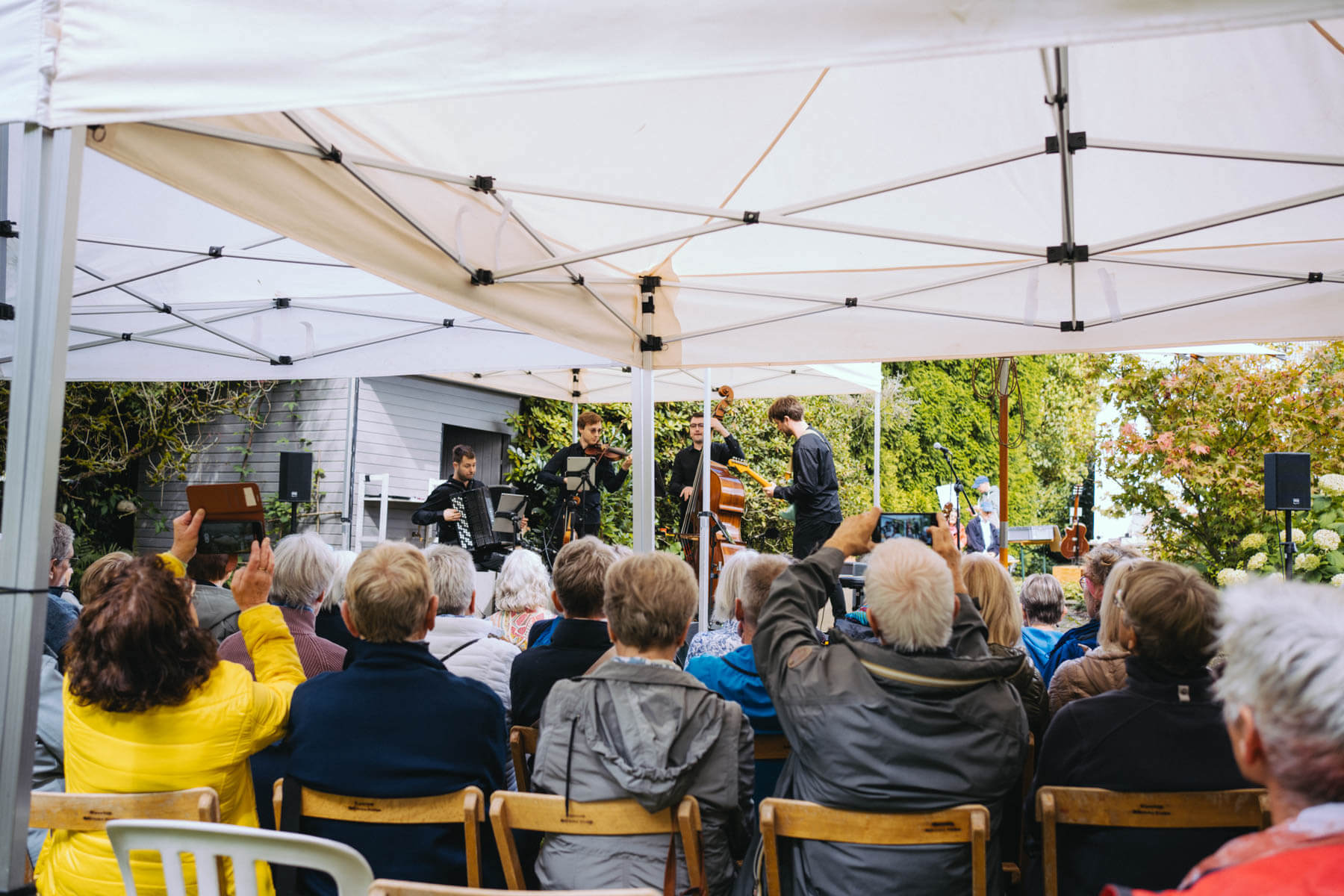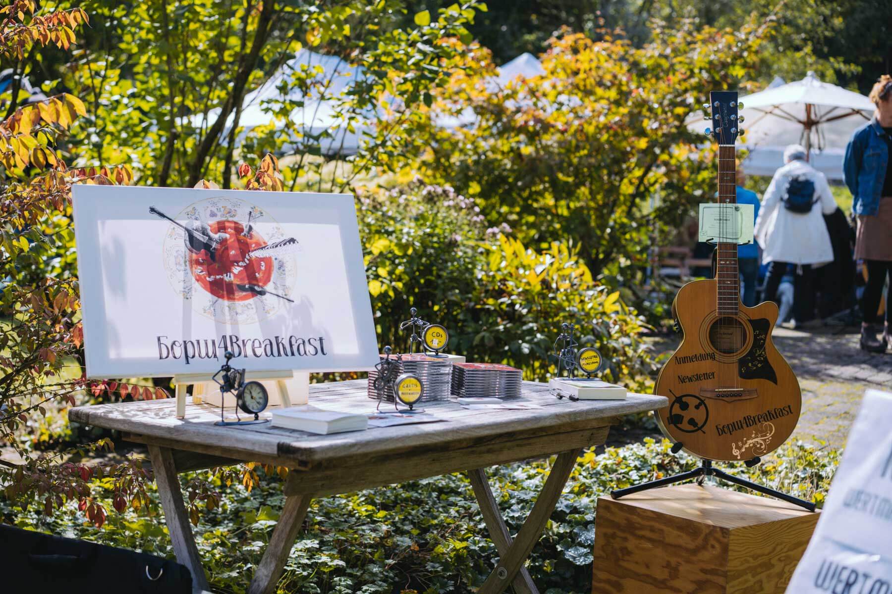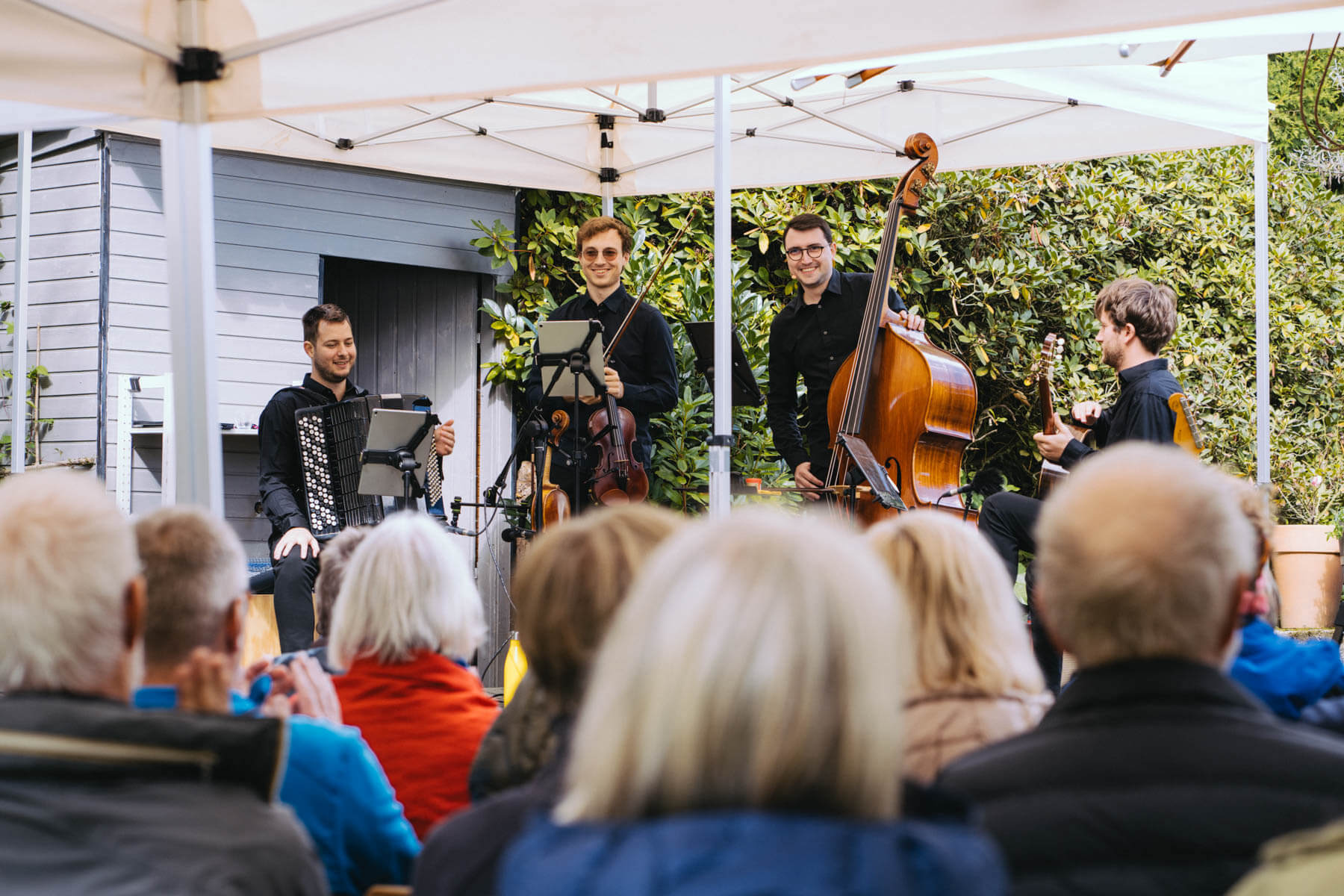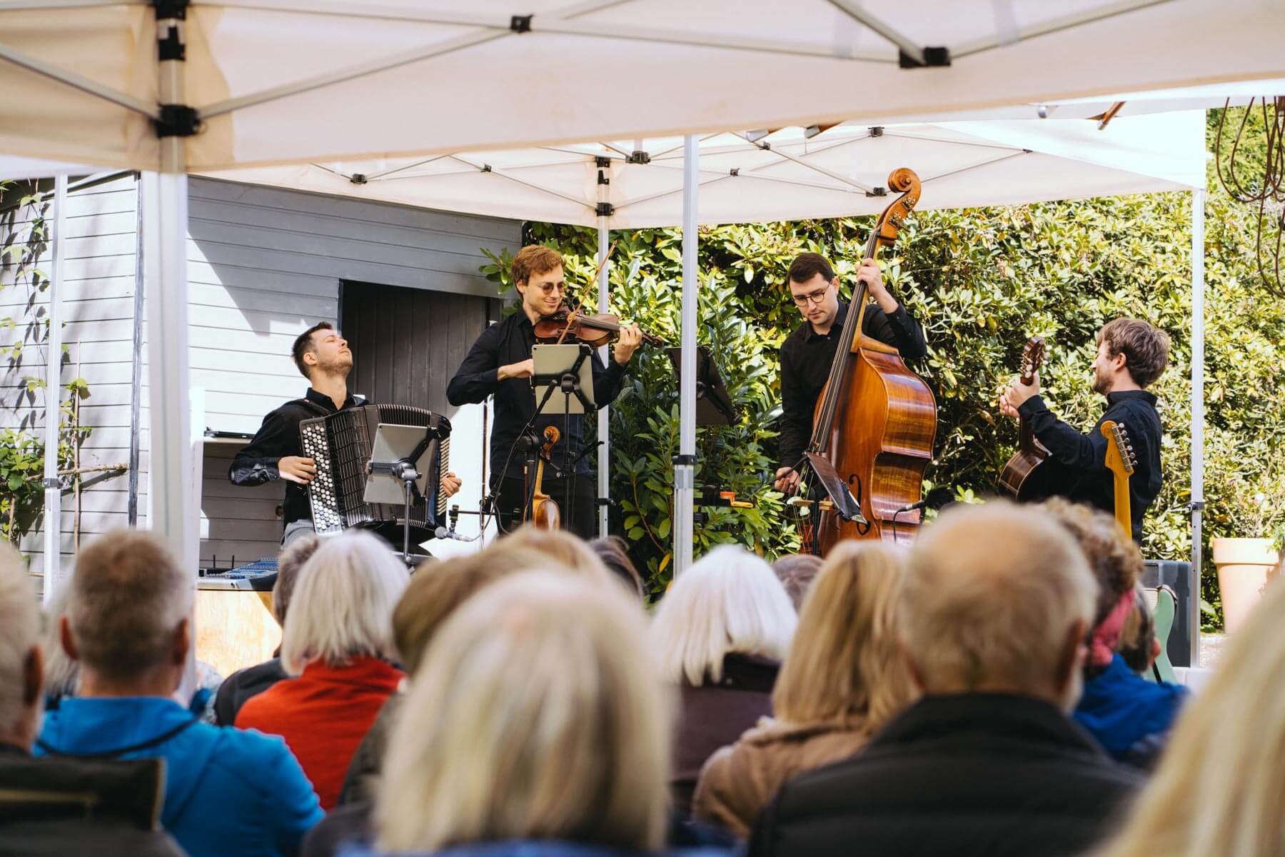 Das diesjährige Abschlusskonzert gab die Gruppe Borsch4Breakfast, die ebenfalls durch die Suchaktion im letzten Jahr in unser Sichtfeld gerückt war. Die vier Musiker reisten aus allen Ecken Deutschlands und der Schweiz an und spielten (nach eigenen Worten) eine „deftige musikalische Suppe“ mit Zutaten aus osteuropäischer Folklore, Balkan-Jazz und Klassik. Als sie im letzten Konzertteil auch noch zu singen begannen (und zwar gut! 😉 ), waren unsere Herzen final gewonnen. Mit rund 130 Besuchenden war die Stimmung wunderbar im Garten von Familie Röllecke, einem zauberhaften, direkt an der Ruhr gelegenen Ort.