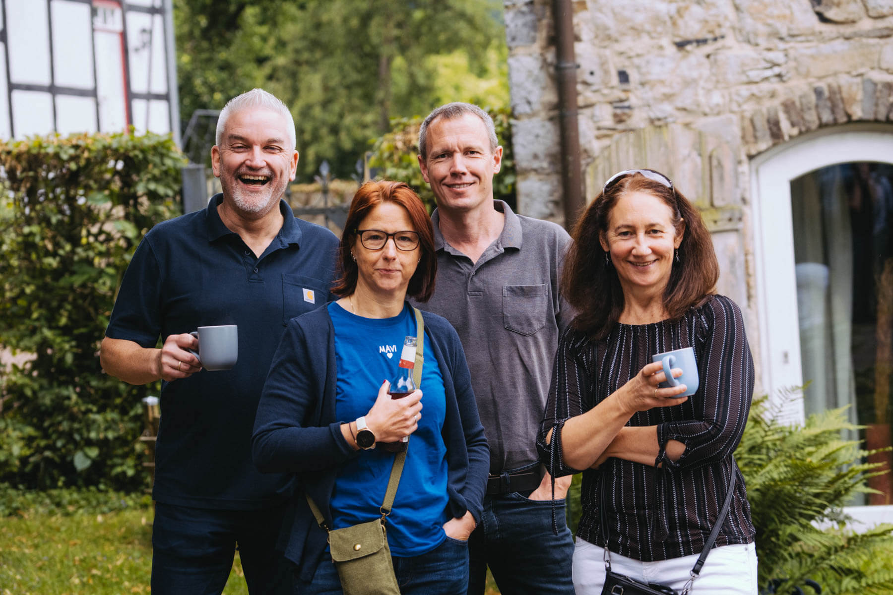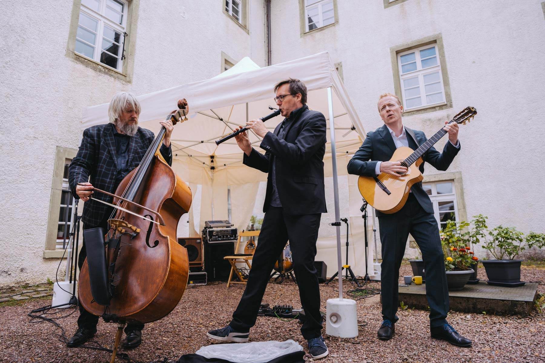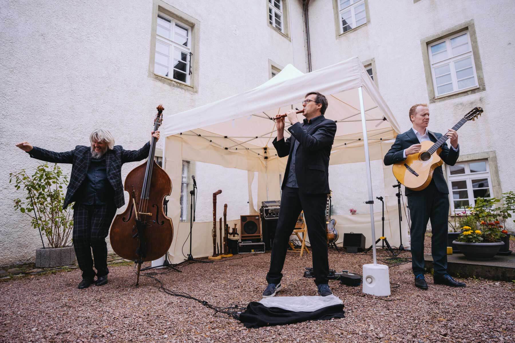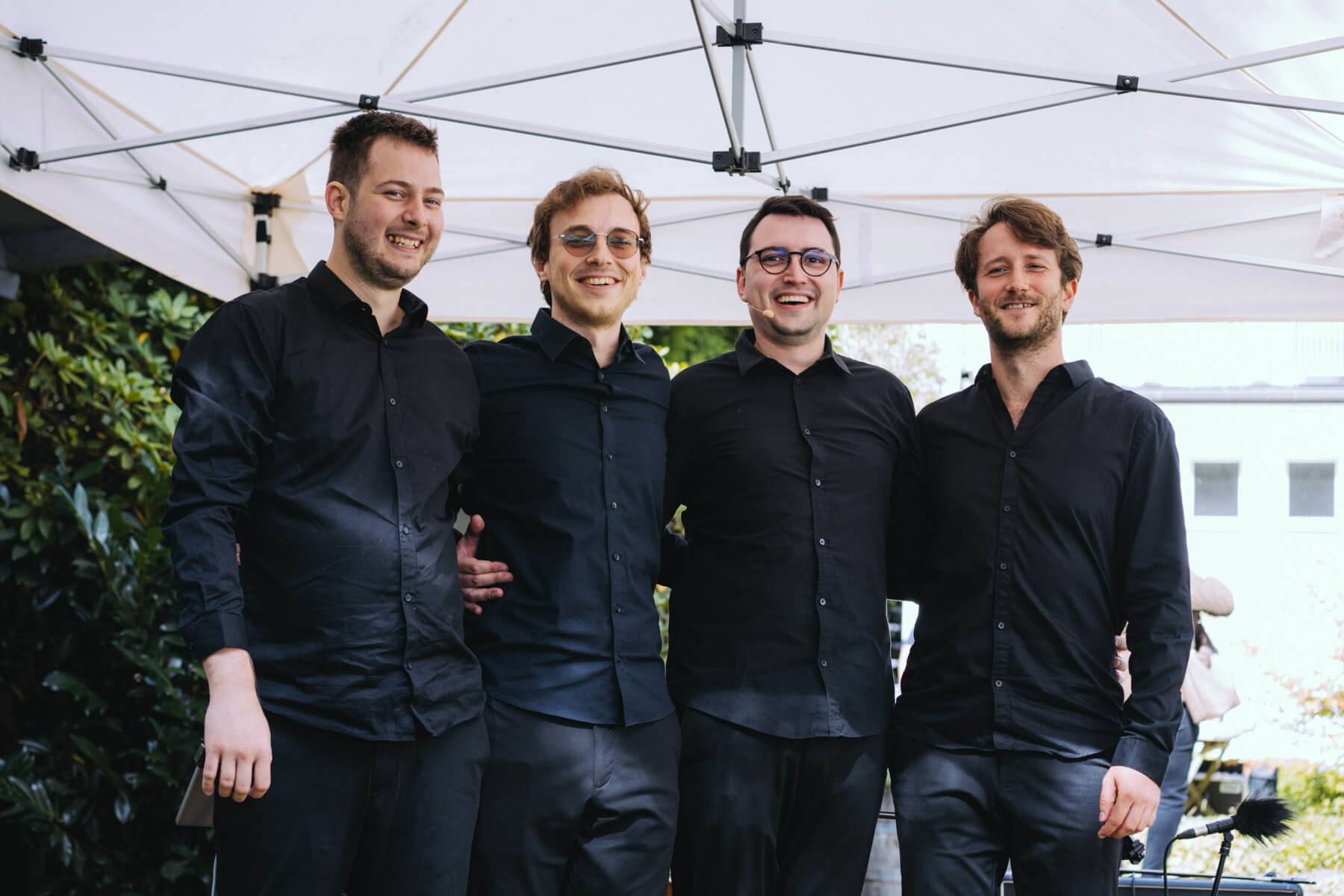 Das diesjährige Abschlusskonzert gab die Gruppe Borsch4Breakfast, die ebenfalls durch die Suchaktion im letzten Jahr in unser Sichtfeld gerückt war. Die vier Musiker reisten aus allen Ecken Deutschlands und der Schweiz an und spielten (nach eigenen Worten) eine „deftige musikalische Suppe“ mit Zutaten aus osteuropäischer Folklore, Balkan-Jazz und Klassik. Als sie im letzten Konzertteil auch noch zu singen begannen (und zwar gut! 😉 ), waren unsere Herzen final gewonnen. Mit rund 130 Besuchenden war die Stimmung wunderbar im Garten von Familie Röllecke, einem zauberhaften, direkt an der Ruhr gelegenen Ort.