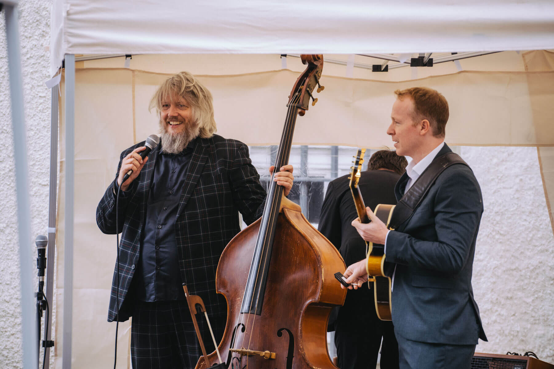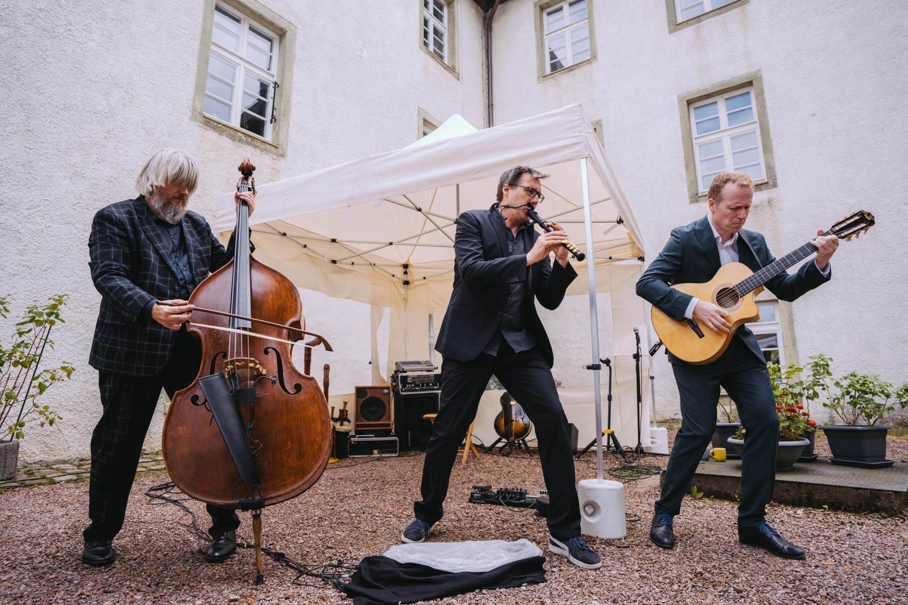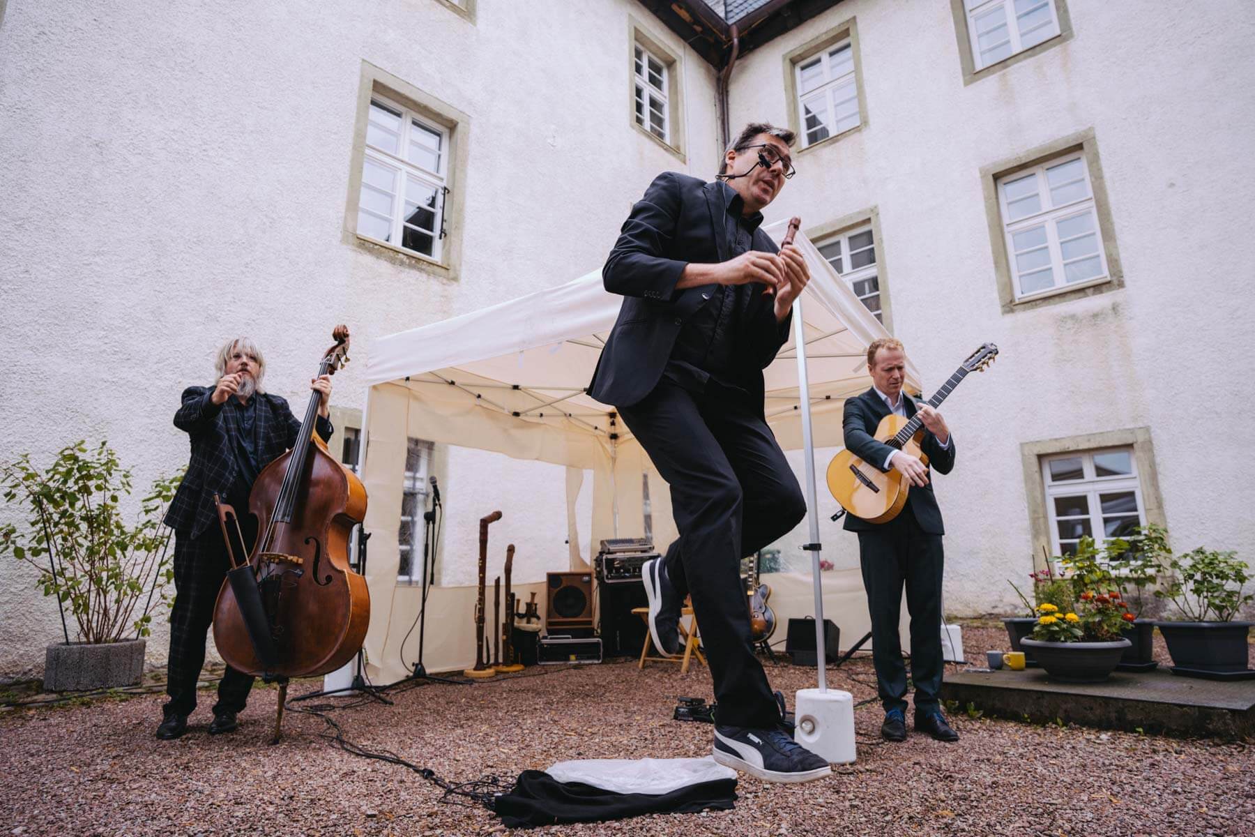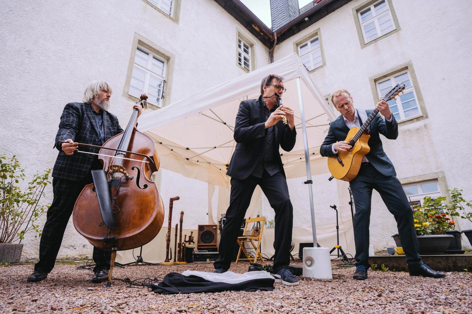 Das diesjährige Abschlusskonzert gab die Gruppe Borsch4Breakfast, die ebenfalls durch die Suchaktion im letzten Jahr in unser Sichtfeld gerückt war. Die vier Musiker reisten aus allen Ecken Deutschlands und der Schweiz an und spielten (nach eigenen Worten) eine „deftige musikalische Suppe“ mit Zutaten aus osteuropäischer Folklore, Balkan-Jazz und Klassik. Als sie im letzten Konzertteil auch noch zu singen begannen (und zwar gut! 😉 ), waren unsere Herzen final gewonnen. Mit rund 130 Besuchenden war die Stimmung wunderbar im Garten von Familie Röllecke, einem zauberhaften, direkt an der Ruhr gelegenen Ort.