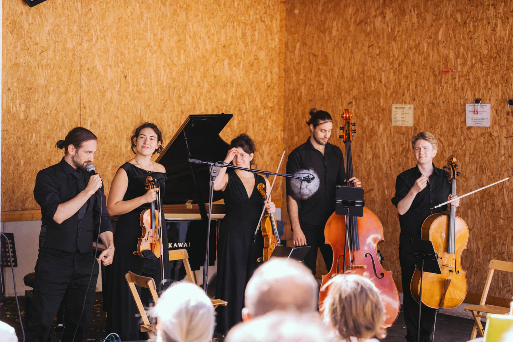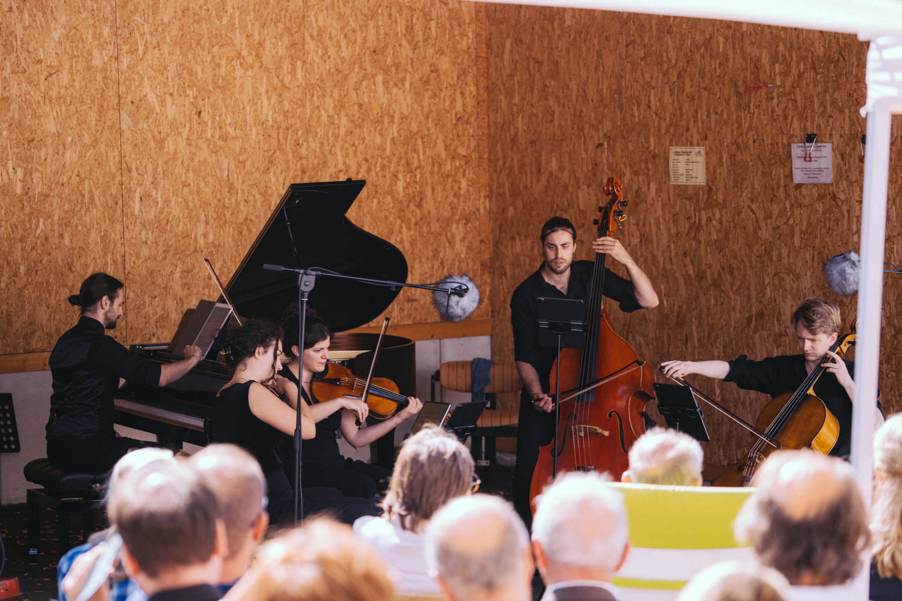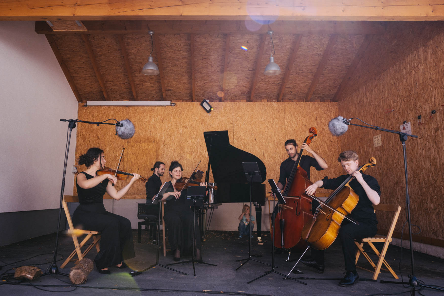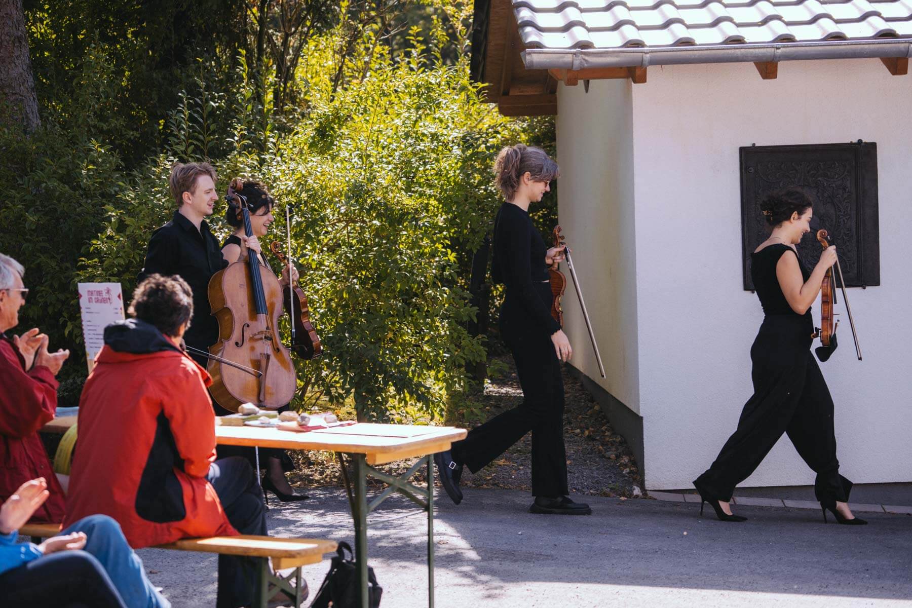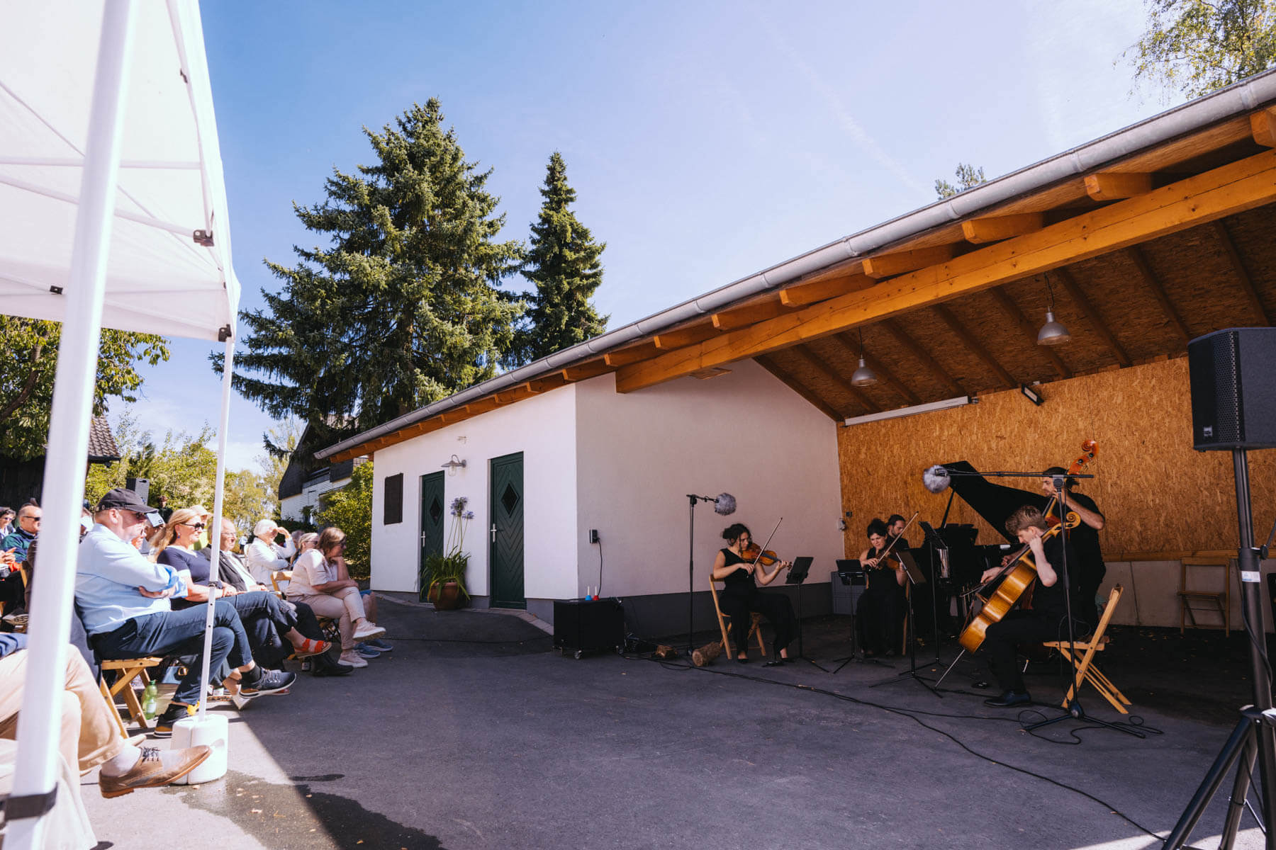 Die Kooperation mit dem Klangraum Festival Köln entstand letztes Jahr, als fünf Musiker:innen, die dort spielten, spontan für die Band UWAGA einsprangen, die aufgrund von Krankheit kurzfristig absagen mussten. Und mit kurzfristig, meinen wir kurzfristig. Samstag früh telefonierte Matinee-Gründer Benedik ter Braak sich durch das inoffizielle Telefonbuch von Musikerkolleg:innen, bis er bei Frederick Winterson landete, welcher am nächsten Morgen mit einem spontan zusammengestellten Ensemble anrückte. In diesem Jahr lief es etwas geplanter ab und nachdem die Musizierenden am 6. September abends in Köln konzertierten, kamen sie am darauffolgenden Morgen (fast) ausgeschlafen auf dem Hof von Familie Becker-Nupe an, wo sich wiederum 250 Gäste auf ein Konzert im Grünen freuten. Neben einem wunderbaren Arrangement von „Summertime“ von Benedikt ter Braak, spielte das Ensemble Schuberts Forellen Quintett und einen Satz aus Beethovens Streichquartett. Glücklicherweise alles, ohne vom hauseigenen Esel unterbrochen zu werden.