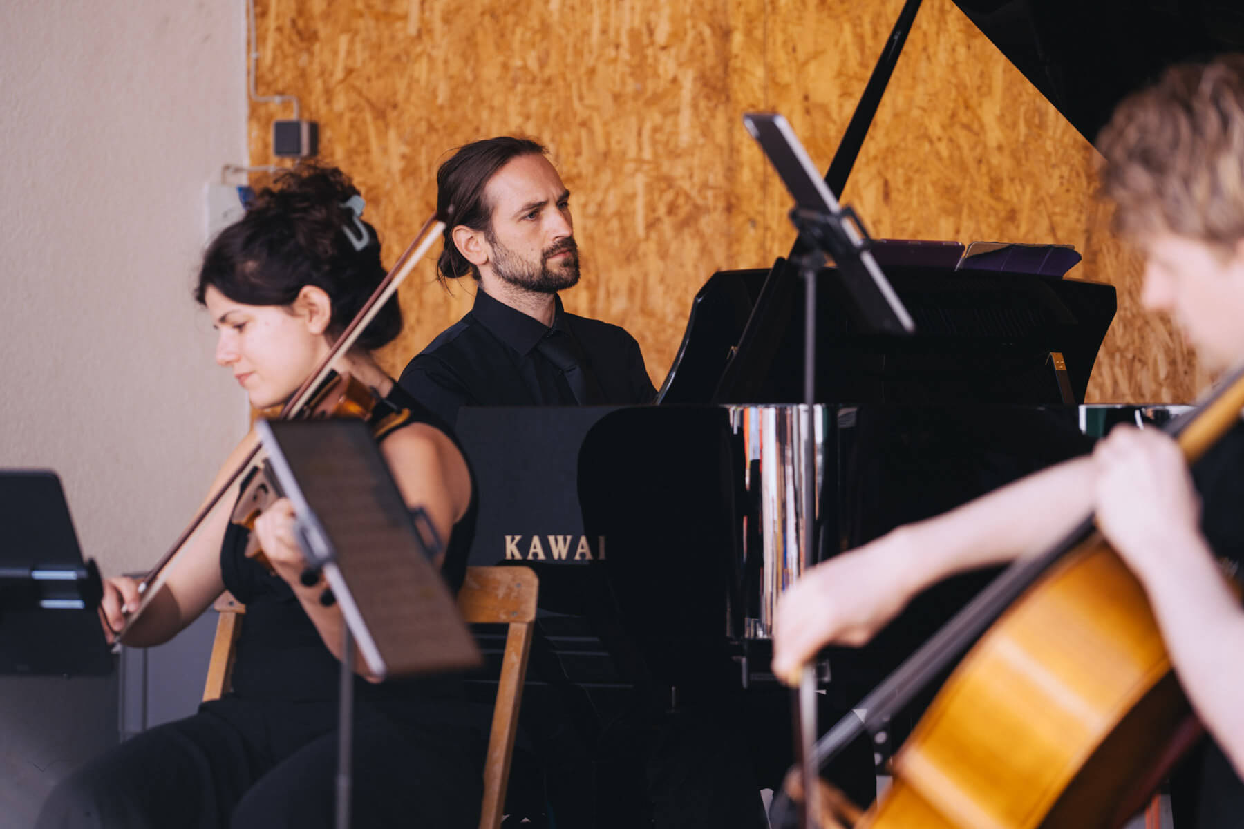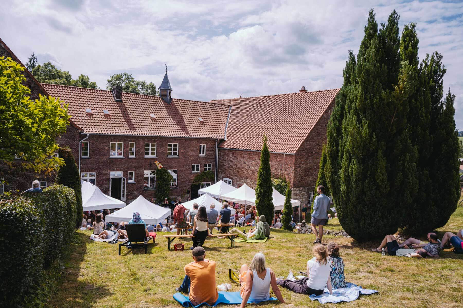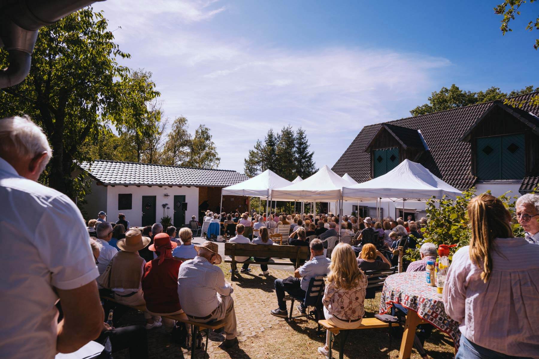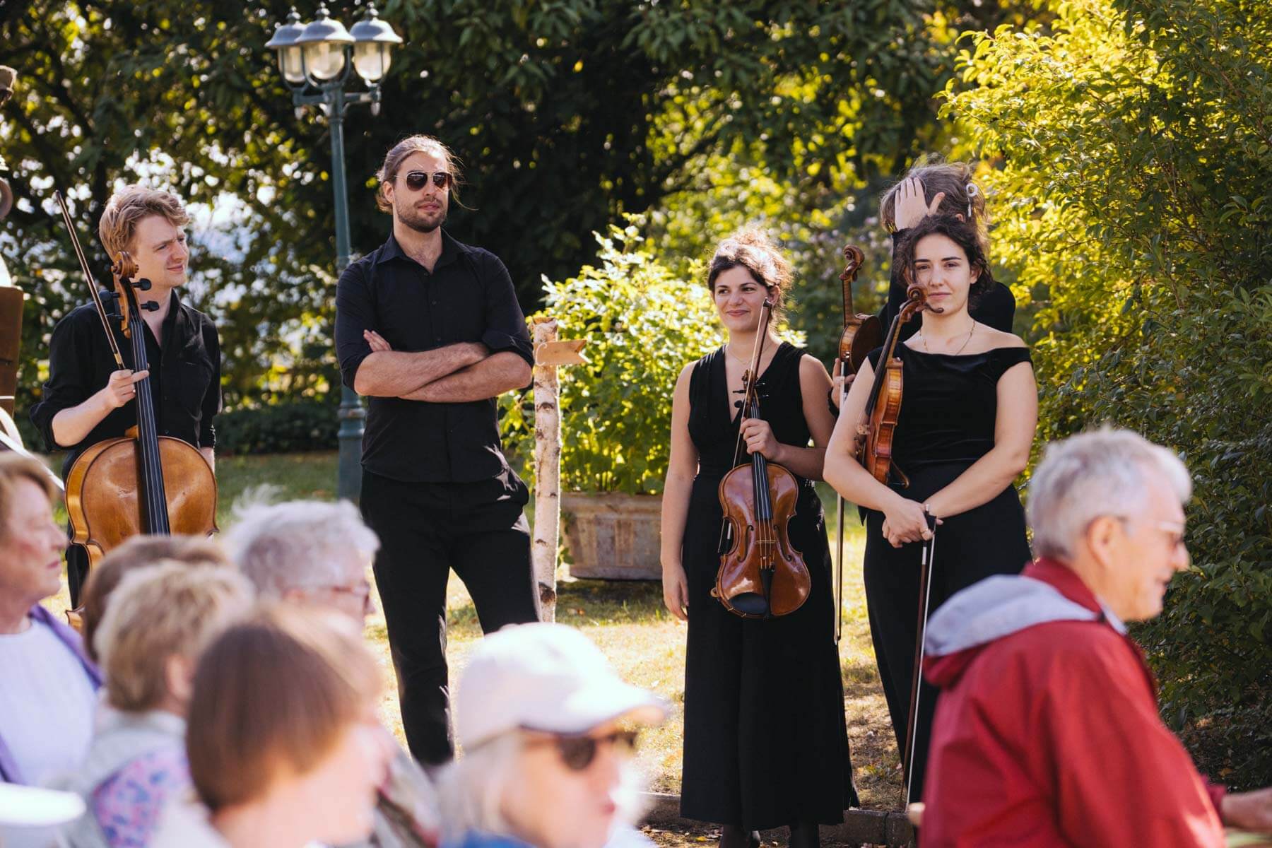 Die Kooperation mit dem Klangraum Festival Köln entstand letztes Jahr, als fünf Musiker:innen, die dort spielten, spontan für die Band UWAGA einsprangen, die aufgrund von Krankheit kurzfristig absagen mussten. Und mit kurzfristig, meinen wir kurzfristig. Samstag früh telefonierte Matinee-Gründer Benedik ter Braak sich durch das inoffizielle Telefonbuch von Musikerkolleg:innen, bis er bei Frederick Winterson landete, welcher am nächsten Morgen mit einem spontan zusammengestellten Ensemble anrückte. In diesem Jahr lief es etwas geplanter ab und nachdem die Musizierenden am 6. September abends in Köln konzertierten, kamen sie am darauffolgenden Morgen (fast) ausgeschlafen auf dem Hof von Familie Becker-Nupe an, wo sich wiederum 250 Gäste auf ein Konzert im Grünen freuten. Neben einem wunderbaren Arrangement von „Summertime“ von Benedikt ter Braak, spielte das Ensemble Schuberts Forellen Quintett und einen Satz aus Beethovens Streichquartett. Glücklicherweise alles, ohne vom hauseigenen Esel unterbrochen zu werden.