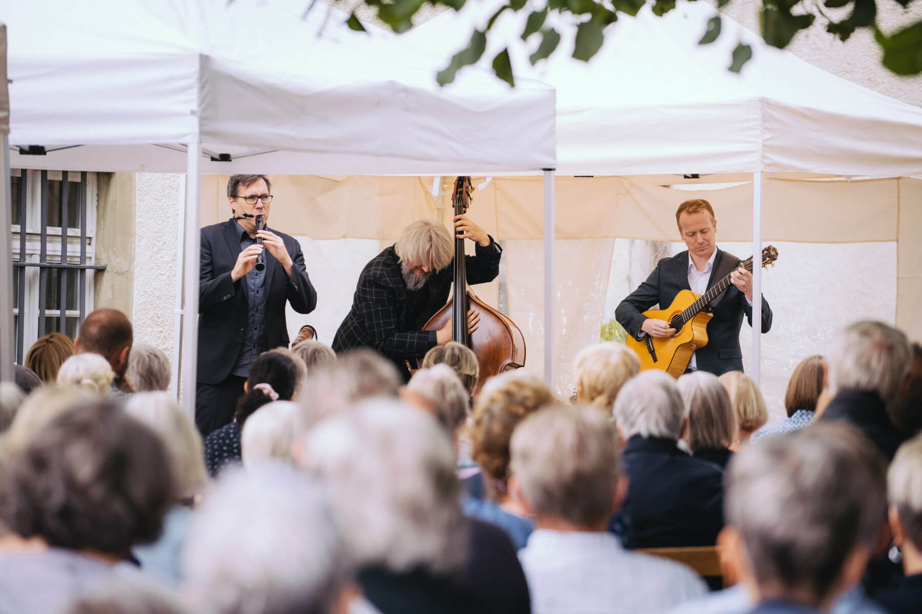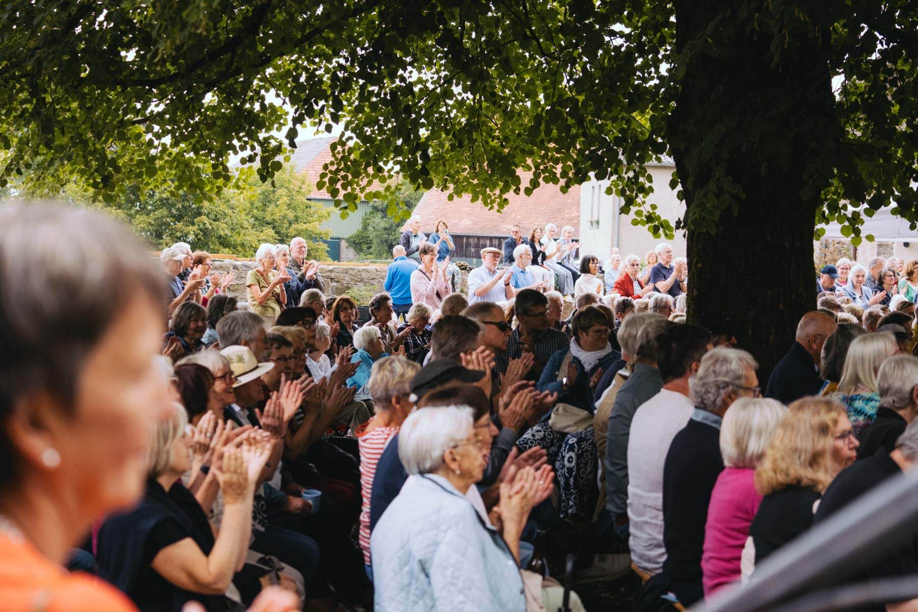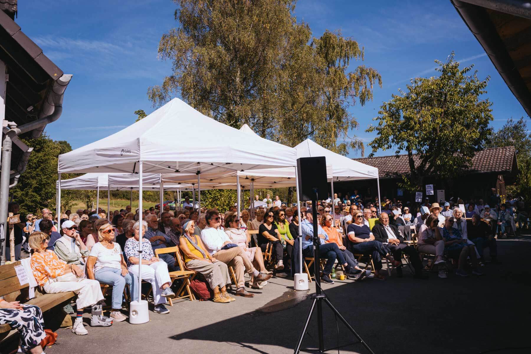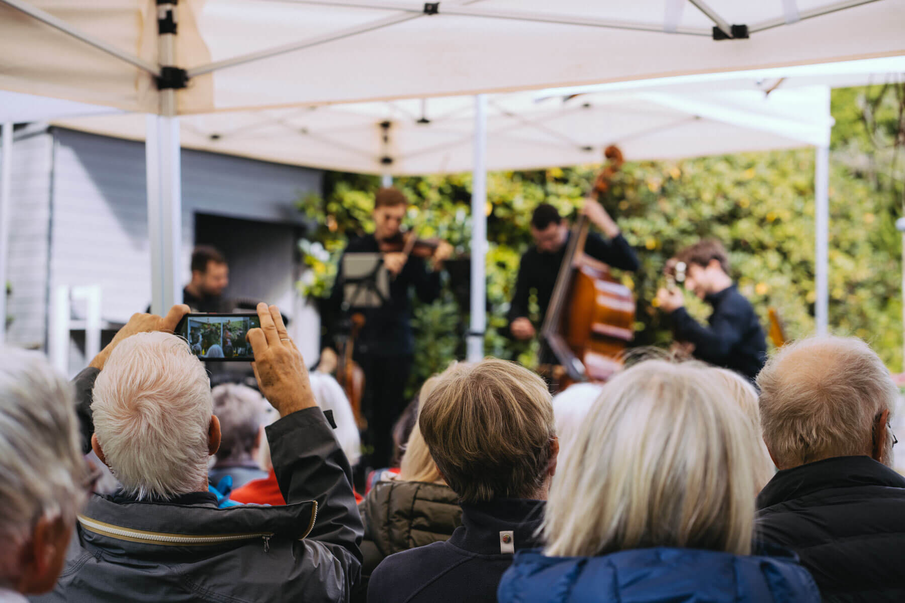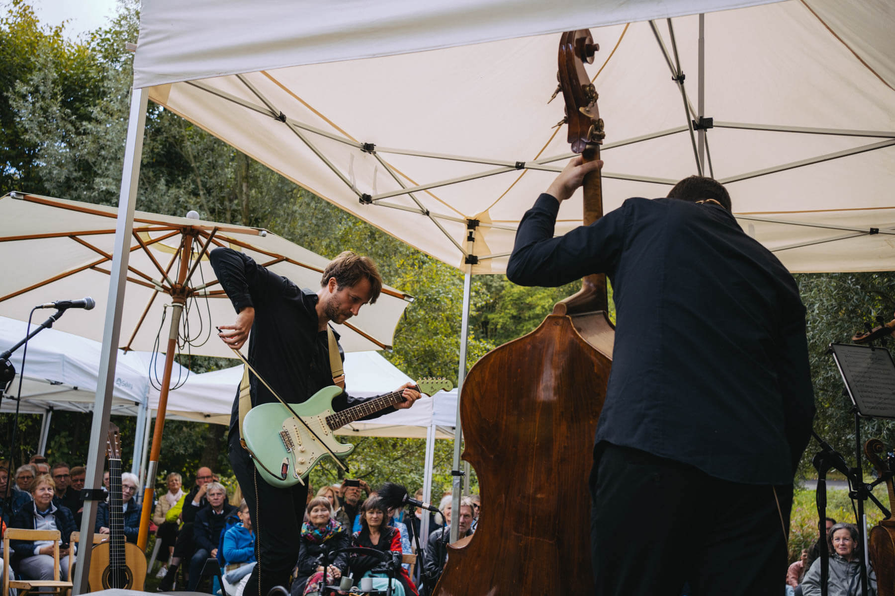 Die Kooperation mit dem Klangraum Festival Köln entstand letztes Jahr, als fünf Musiker:innen, die dort spielten, spontan für die Band UWAGA einsprangen, die aufgrund von Krankheit kurzfristig absagen mussten. Und mit kurzfristig, meinen wir kurzfristig. Samstag früh telefonierte Matinee-Gründer Benedik ter Braak sich durch das inoffizielle Telefonbuch von Musikerkolleg:innen, bis er bei Frederick Winterson landete, welcher am nächsten Morgen mit einem spontan zusammengestellten Ensemble anrückte. In diesem Jahr lief es etwas geplanter ab und nachdem die Musizierenden am 6. September abends in Köln konzertierten, kamen sie am darauffolgenden Morgen (fast) ausgeschlafen auf dem Hof von Familie Becker-Nupe an, wo sich wiederum 250 Gäste auf ein Konzert im Grünen freuten. Neben einem wunderbaren Arrangement von „Summertime“ von Benedikt ter Braak, spielte das Ensemble Schuberts Forellen Quintett und einen Satz aus Beethovens Streichquartett. Glücklicherweise alles, ohne vom hauseigenen Esel unterbrochen zu werden.