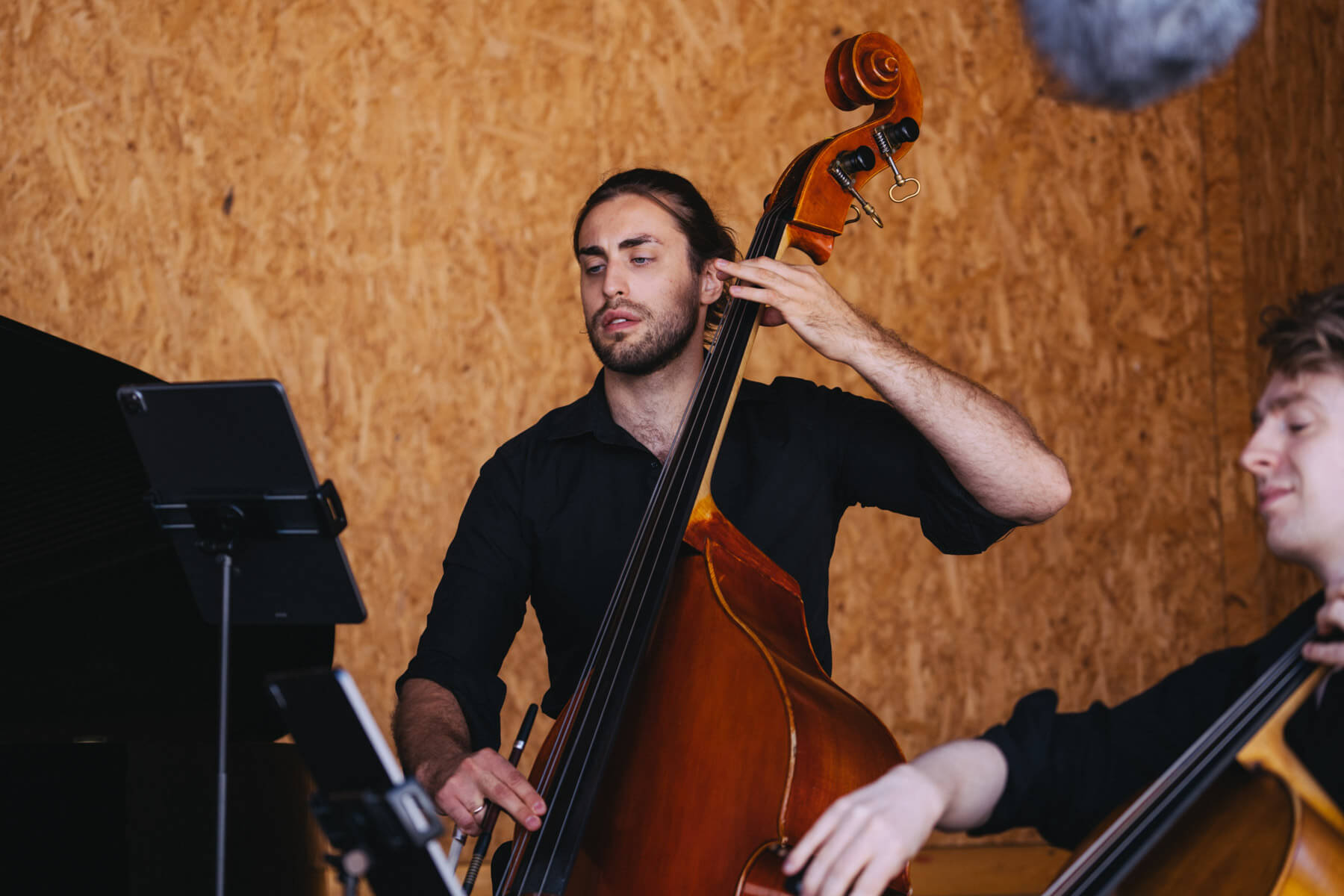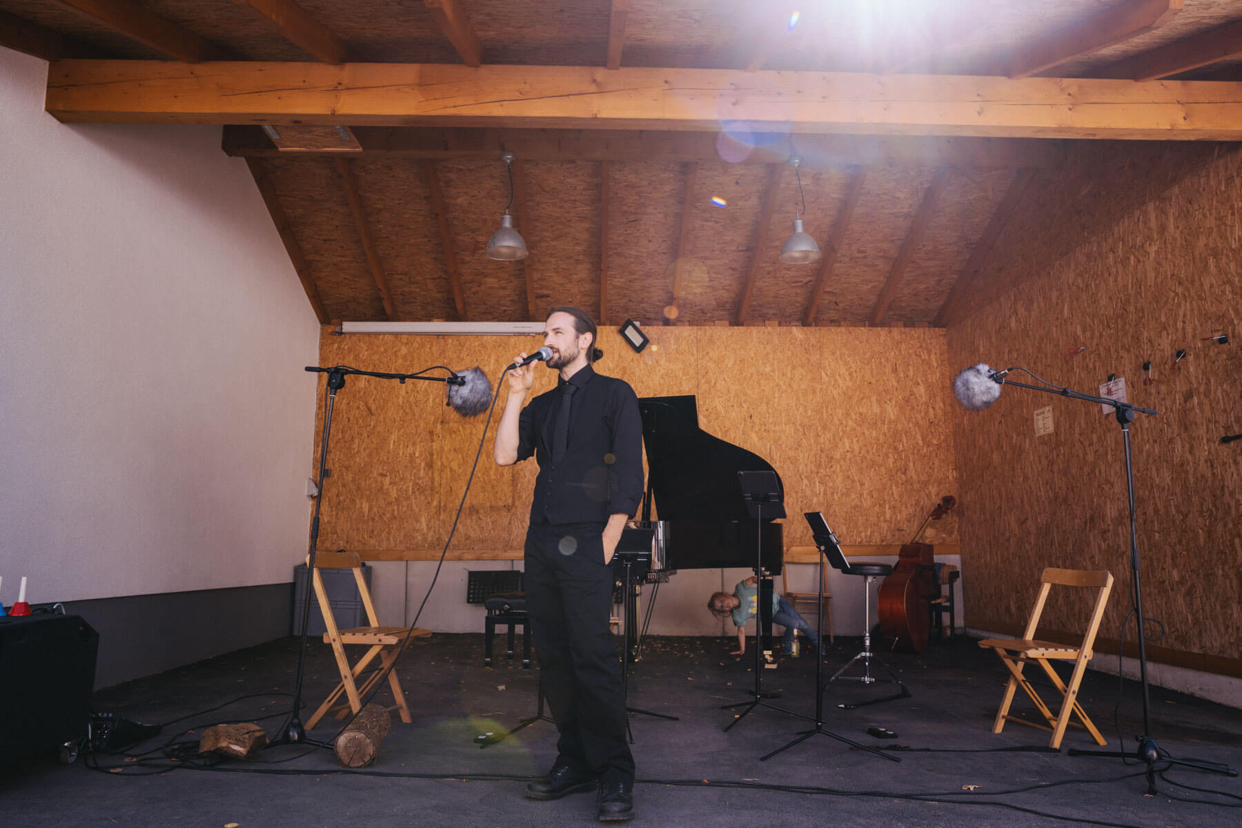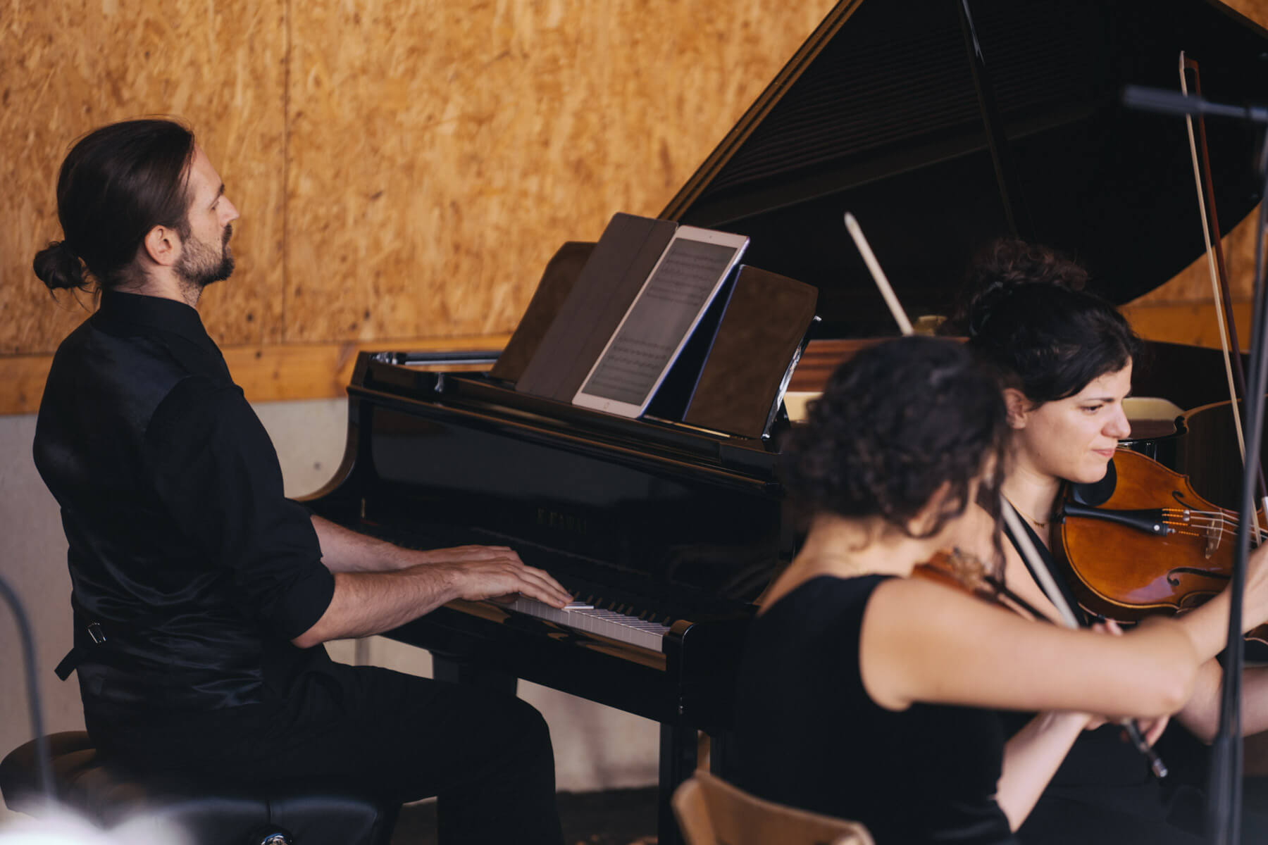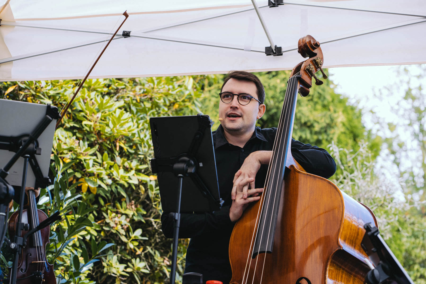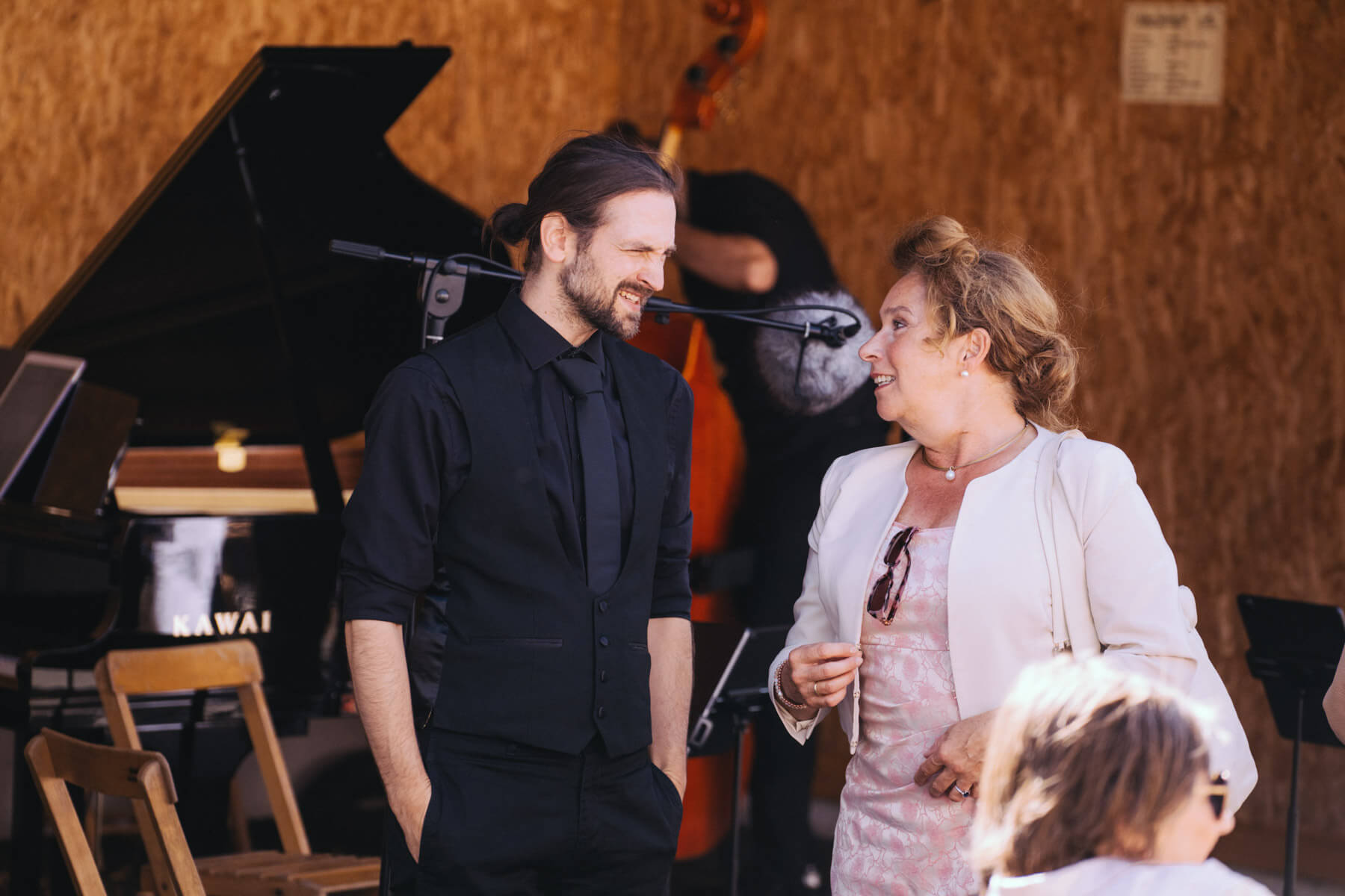 Die Kooperation mit dem Klangraum Festival Köln entstand letztes Jahr, als fünf Musiker:innen, die dort spielten, spontan für die Band UWAGA einsprangen, die aufgrund von Krankheit kurzfristig absagen mussten. Und mit kurzfristig, meinen wir kurzfristig. Samstag früh telefonierte Matinee-Gründer Benedik ter Braak sich durch das inoffizielle Telefonbuch von Musikerkolleg:innen, bis er bei Frederick Winterson landete, welcher am nächsten Morgen mit einem spontan zusammengestellten Ensemble anrückte. In diesem Jahr lief es etwas geplanter ab und nachdem die Musizierenden am 6. September abends in Köln konzertierten, kamen sie am darauffolgenden Morgen (fast) ausgeschlafen auf dem Hof von Familie Becker-Nupe an, wo sich wiederum 250 Gäste auf ein Konzert im Grünen freuten. Neben einem wunderbaren Arrangement von „Summertime“ von Benedikt ter Braak, spielte das Ensemble Schuberts Forellen Quintett und einen Satz aus Beethovens Streichquartett. Glücklicherweise alles, ohne vom hauseigenen Esel unterbrochen zu werden.