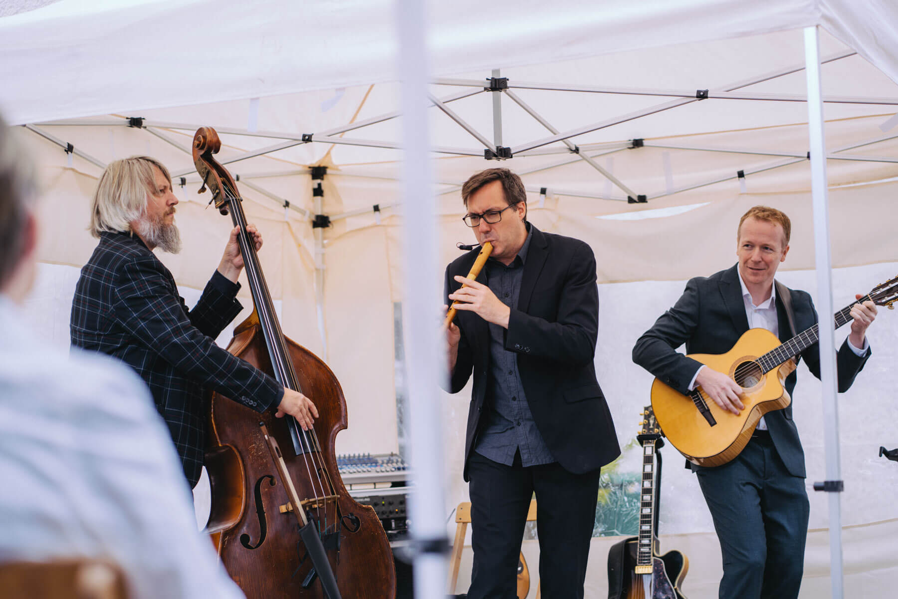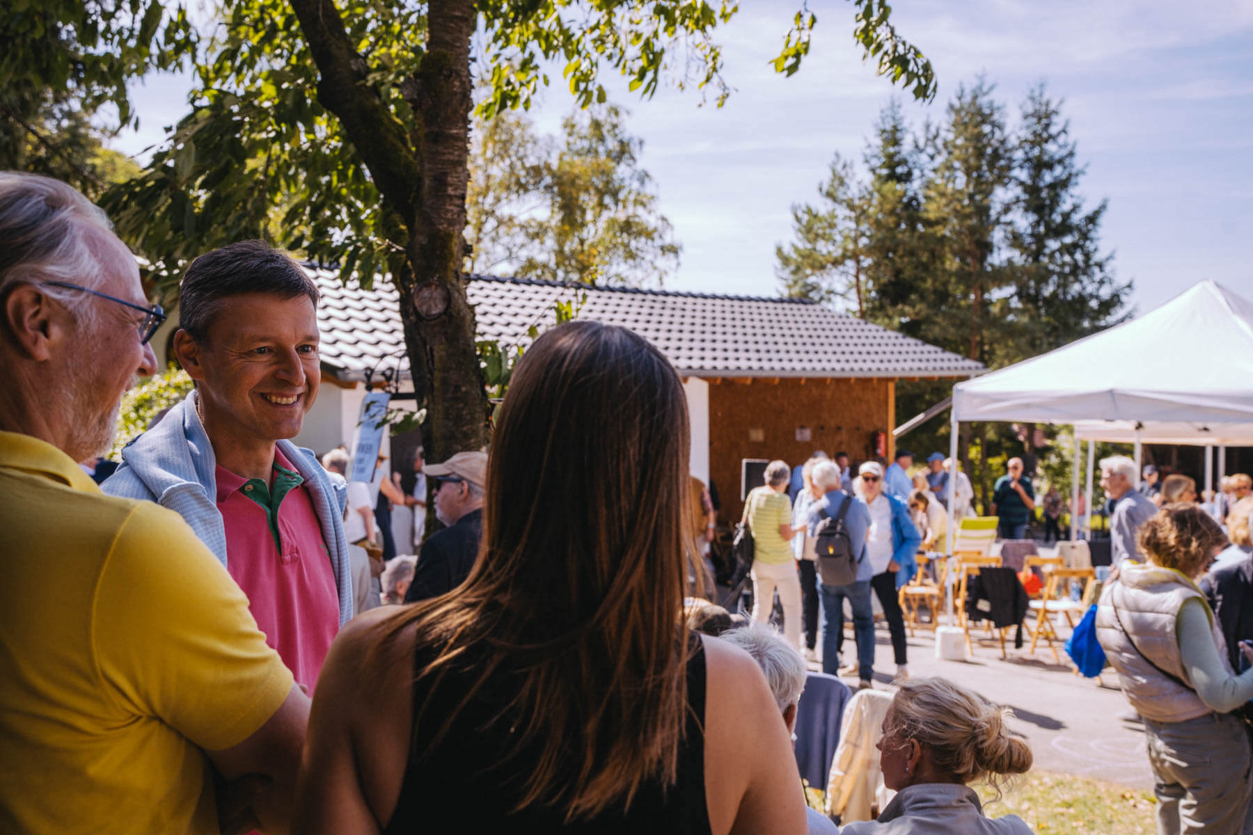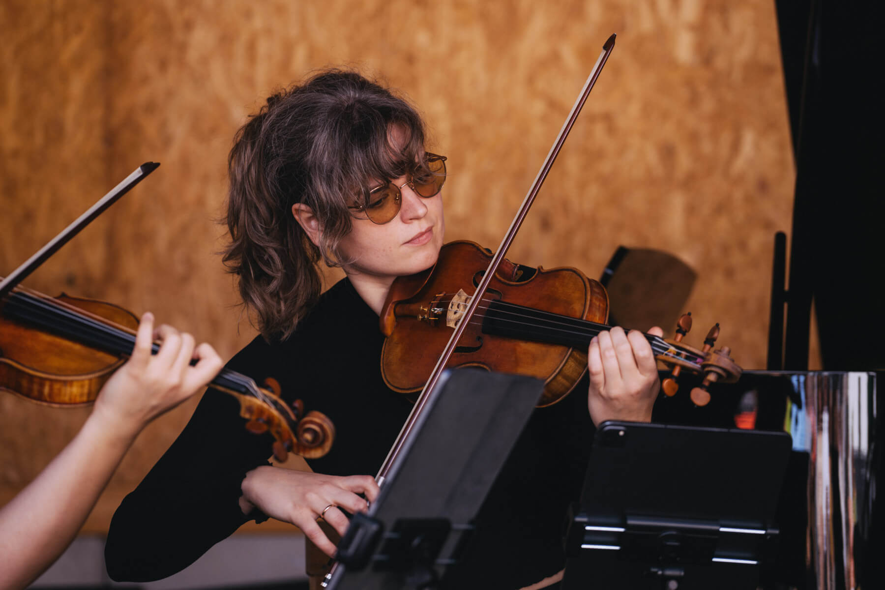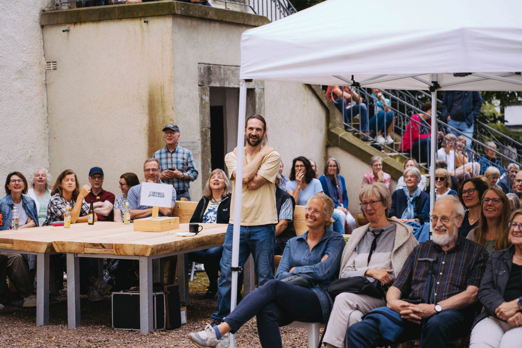 Die Kooperation mit dem Klangraum Festival Köln entstand letztes Jahr, als fünf Musiker:innen, die dort spielten, spontan für die Band UWAGA einsprangen, die aufgrund von Krankheit kurzfristig absagen mussten. Und mit kurzfristig, meinen wir kurzfristig. Samstag früh telefonierte Matinee-Gründer Benedik ter Braak sich durch das inoffizielle Telefonbuch von Musikerkolleg:innen, bis er bei Frederick Winterson landete, welcher am nächsten Morgen mit einem spontan zusammengestellten Ensemble anrückte. In diesem Jahr lief es etwas geplanter ab und nachdem die Musizierenden am 6. September abends in Köln konzertierten, kamen sie am darauffolgenden Morgen (fast) ausgeschlafen auf dem Hof von Familie Becker-Nupe an, wo sich wiederum 250 Gäste auf ein Konzert im Grünen freuten. Neben einem wunderbaren Arrangement von „Summertime“ von Benedikt ter Braak, spielte das Ensemble Schuberts Forellen Quintett und einen Satz aus Beethovens Streichquartett. Glücklicherweise alles, ohne vom hauseigenen Esel unterbrochen zu werden.