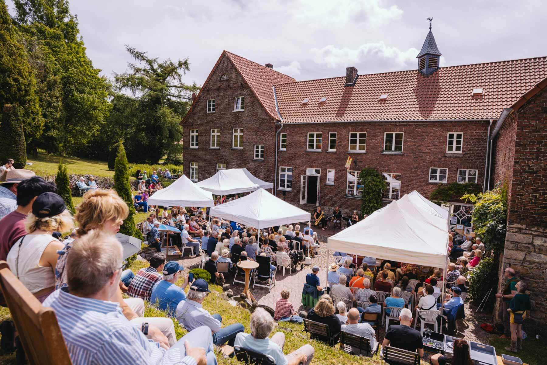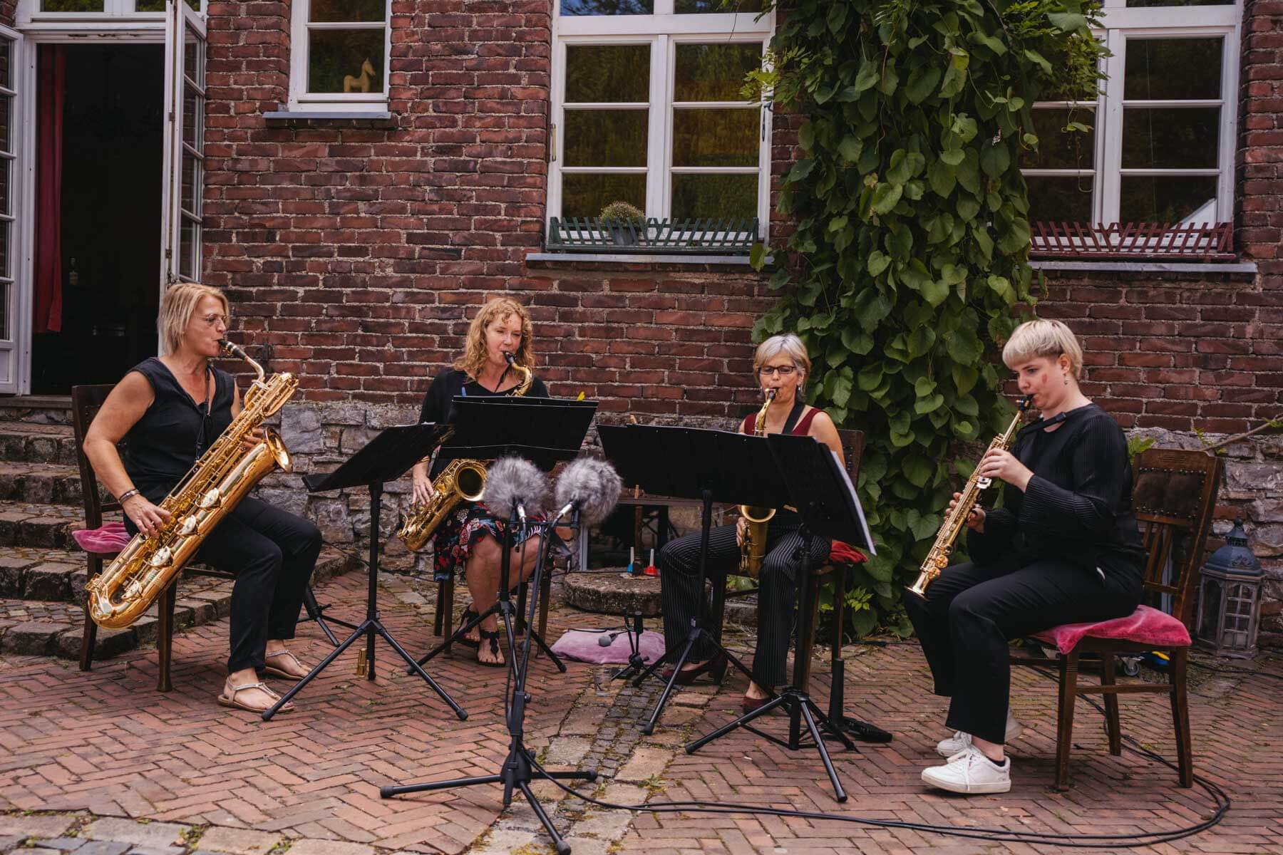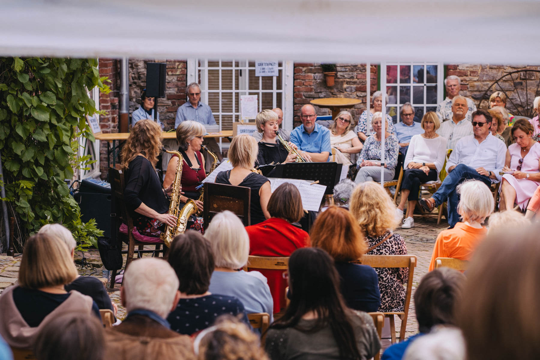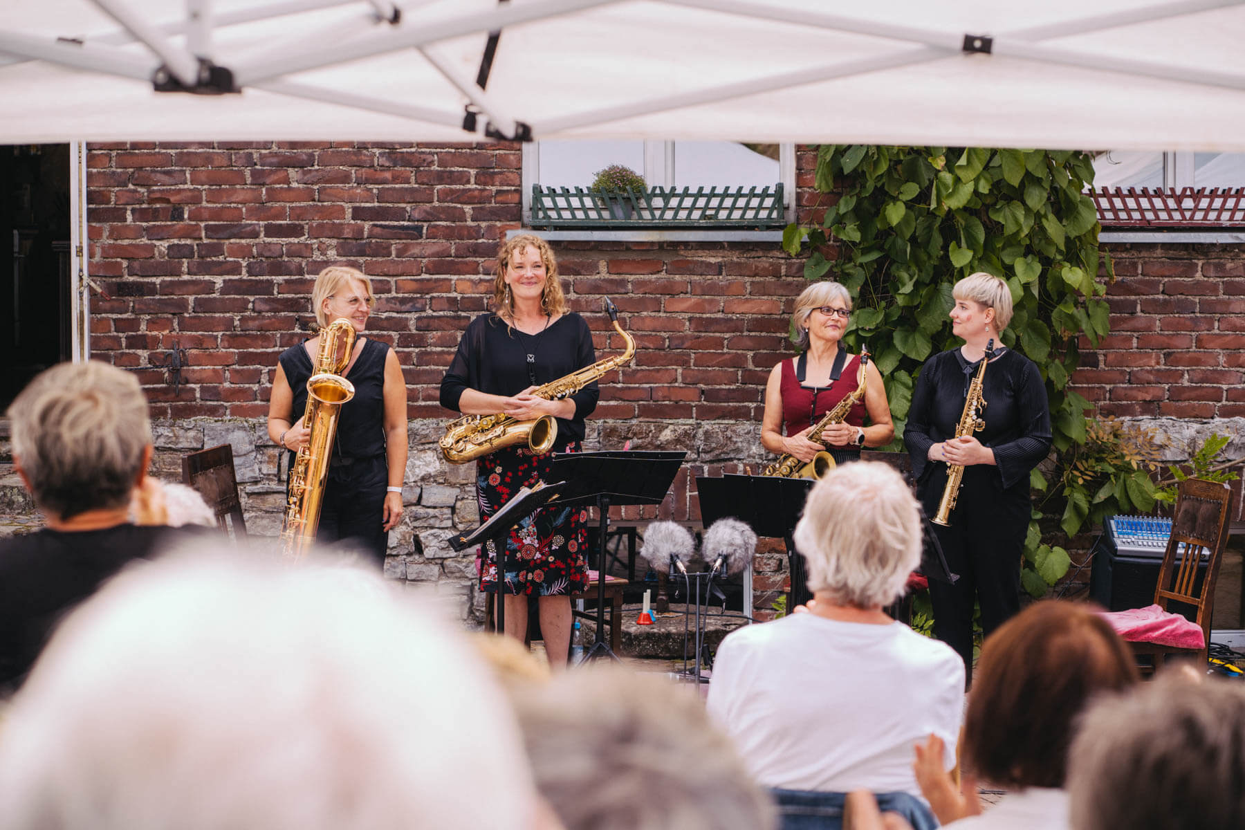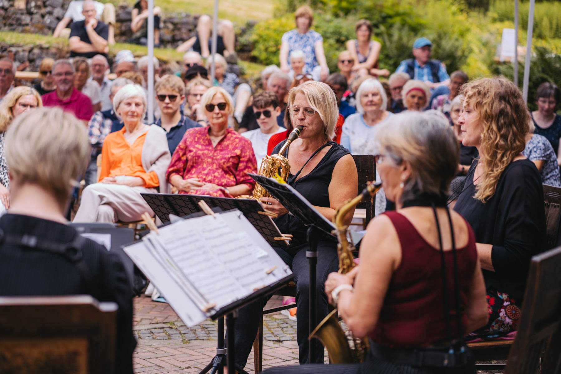 Tatsächlich hatten wir erst einmal ein reines Bläser-Ensemble zu Gast (2022, das Solano Sextett der Duisburger Philharmoniker) und dementsprechend freuten wir uns besonders auf das Lilith Saxophon Quartett, welches das zweite Konzert diesen Jahres spielte. Vier Musikerinnen vom Feinsten spielten ein buntes Programm von Klassik bis Jazz für rund 250 Besucher:innen. Das Wetter war toll, die Musik erst recht und der Garten von Familie Schulte-Illingheim haute uns alle um: Durch die Deele (ein Wort, das nicht alle von uns kannten 😉 ) kommt man in eine Art Open-Air Auditorium inmitten eines wunderschönen, weitläufigen Gartens – als wäre dieser Garten eigens für uns angelegt worden.