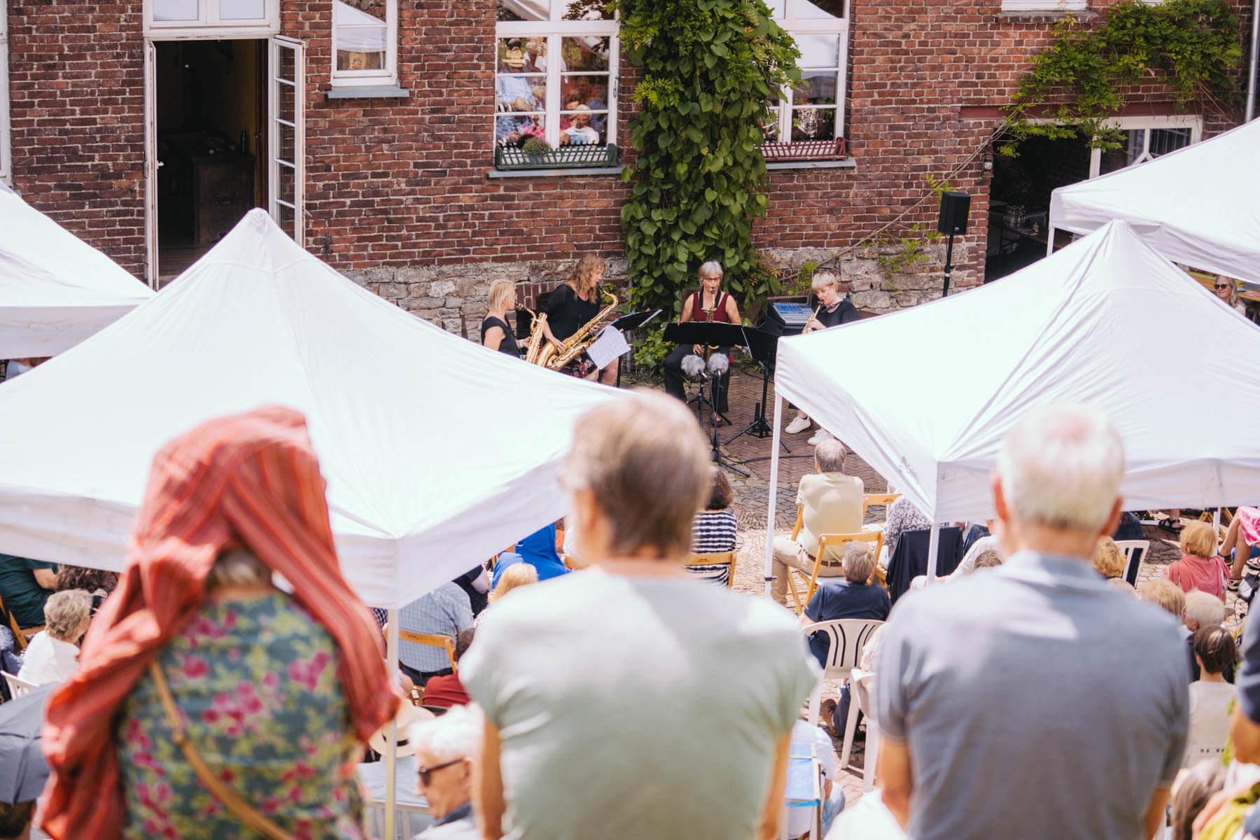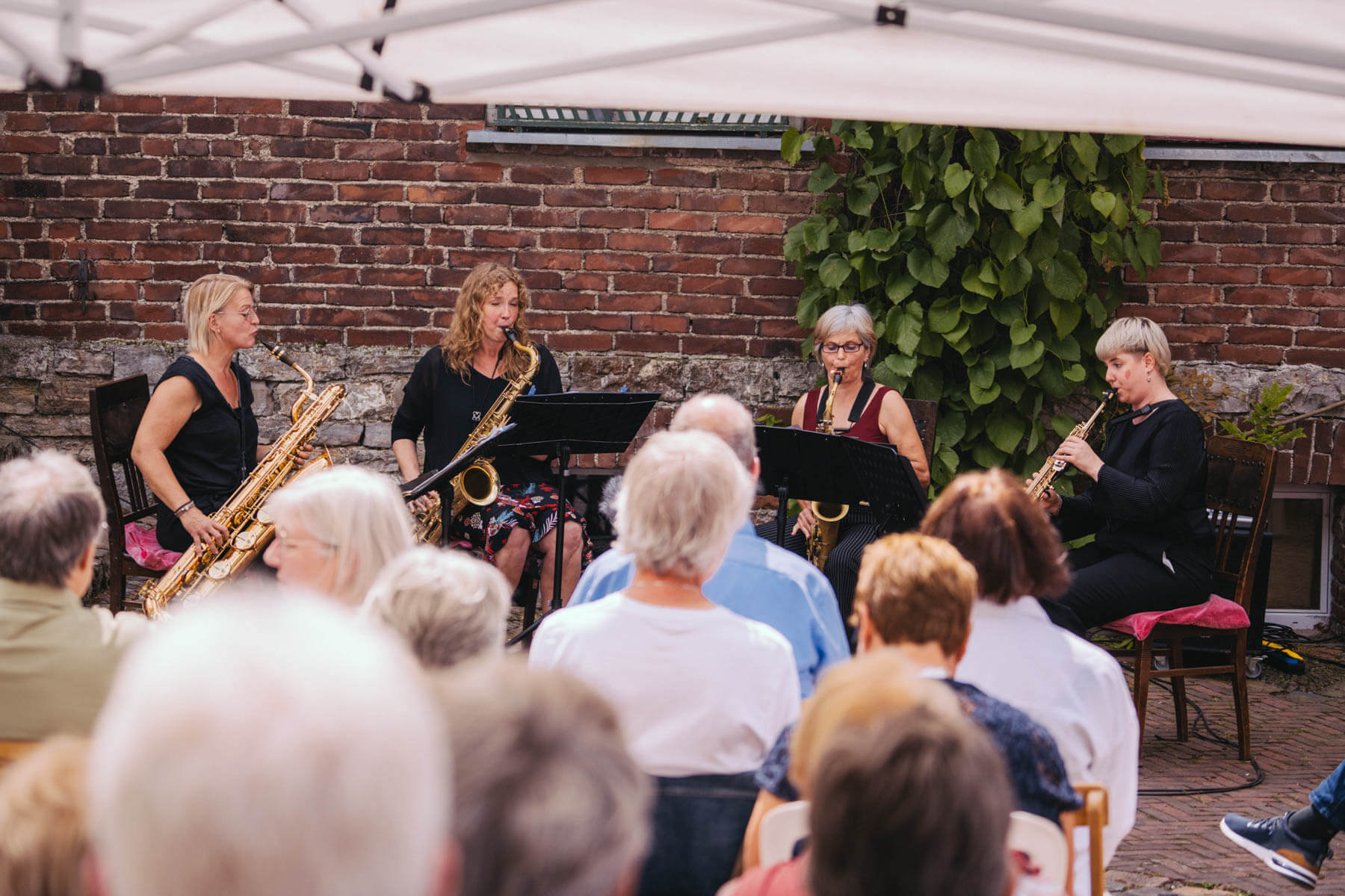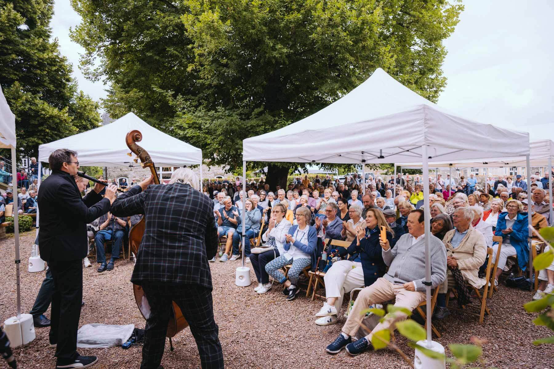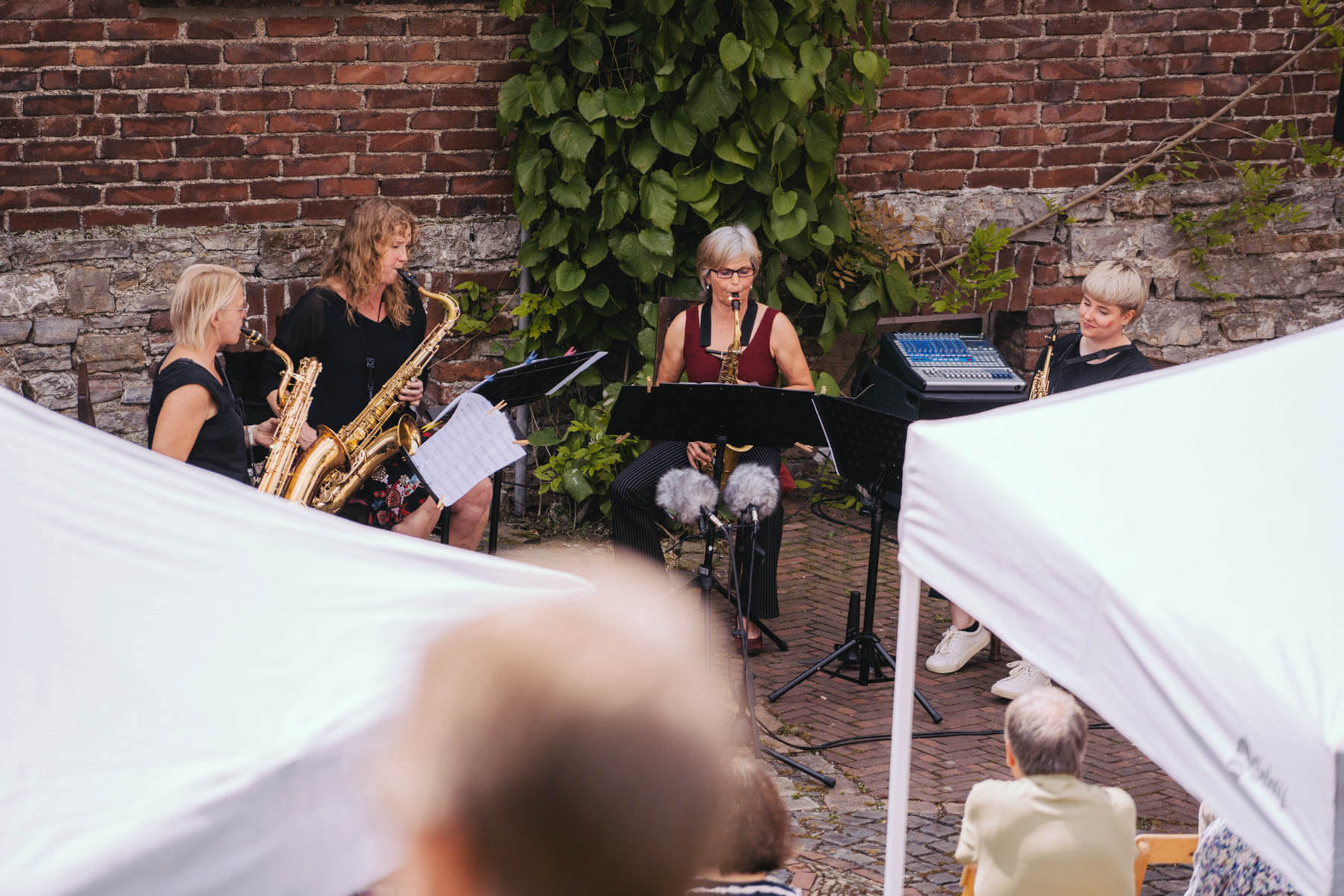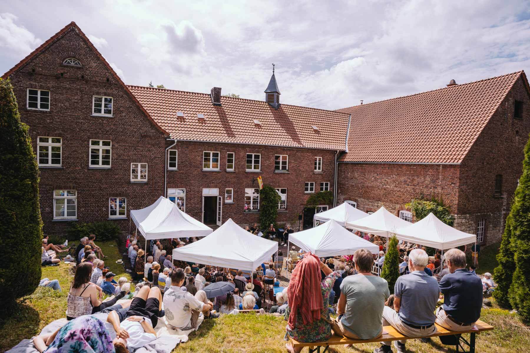 Tatsächlich hatten wir erst einmal ein reines Bläser-Ensemble zu Gast (2022, das Solano Sextett der Duisburger Philharmoniker) und dementsprechend freuten wir uns besonders auf das Lilith Saxophon Quartett, welches das zweite Konzert diesen Jahres spielte. Vier Musikerinnen vom Feinsten spielten ein buntes Programm von Klassik bis Jazz für rund 250 Besucher:innen. Das Wetter war toll, die Musik erst recht und der Garten von Familie Schulte-Illingheim haute uns alle um: Durch die Deele (ein Wort, das nicht alle von uns kannten 😉 ) kommt man in eine Art Open-Air Auditorium inmitten eines wunderschönen, weitläufigen Gartens – als wäre dieser Garten eigens für uns angelegt worden.