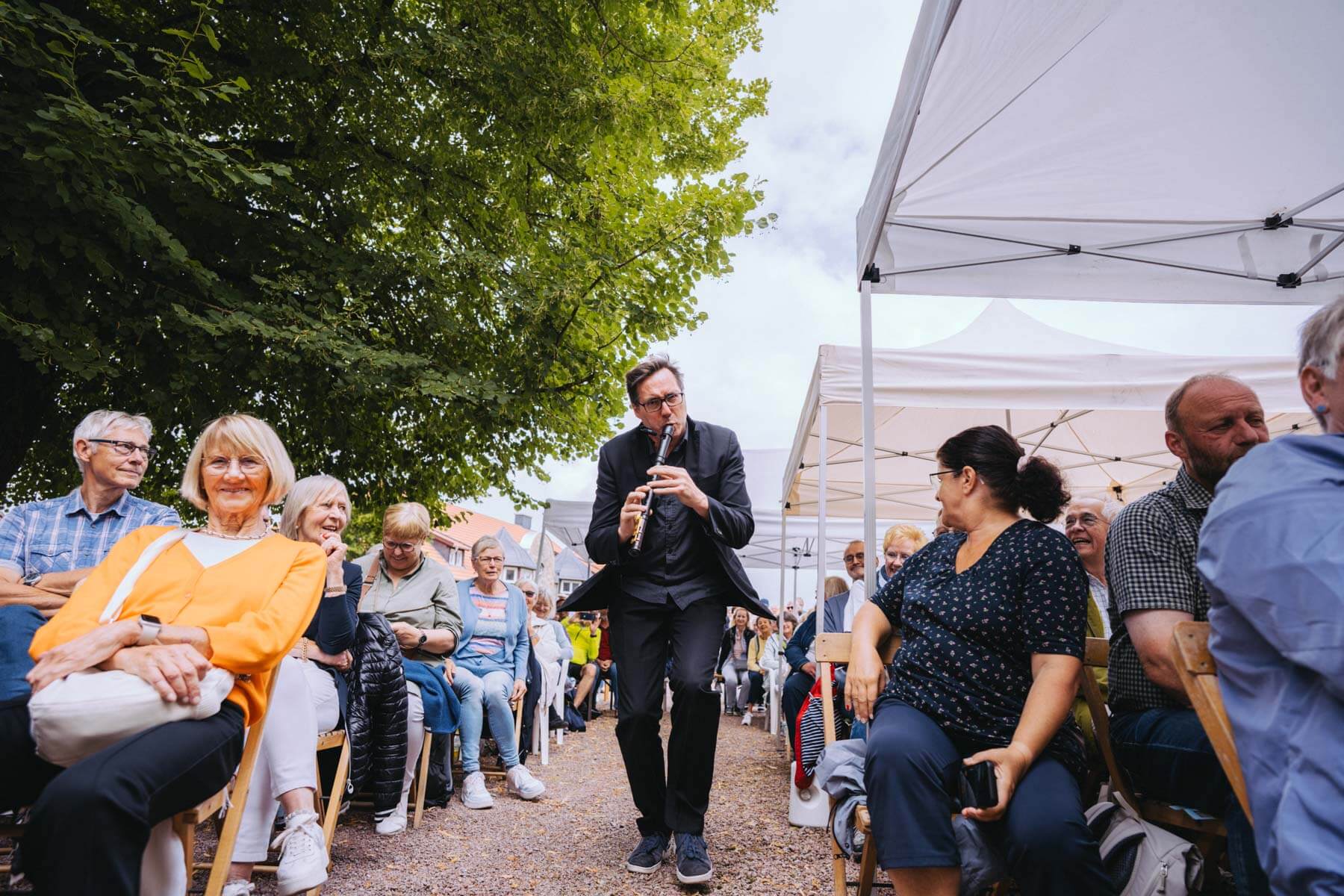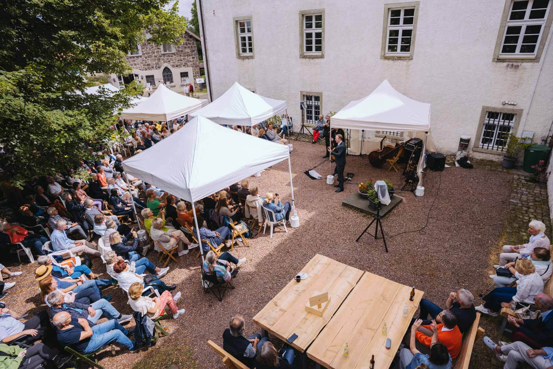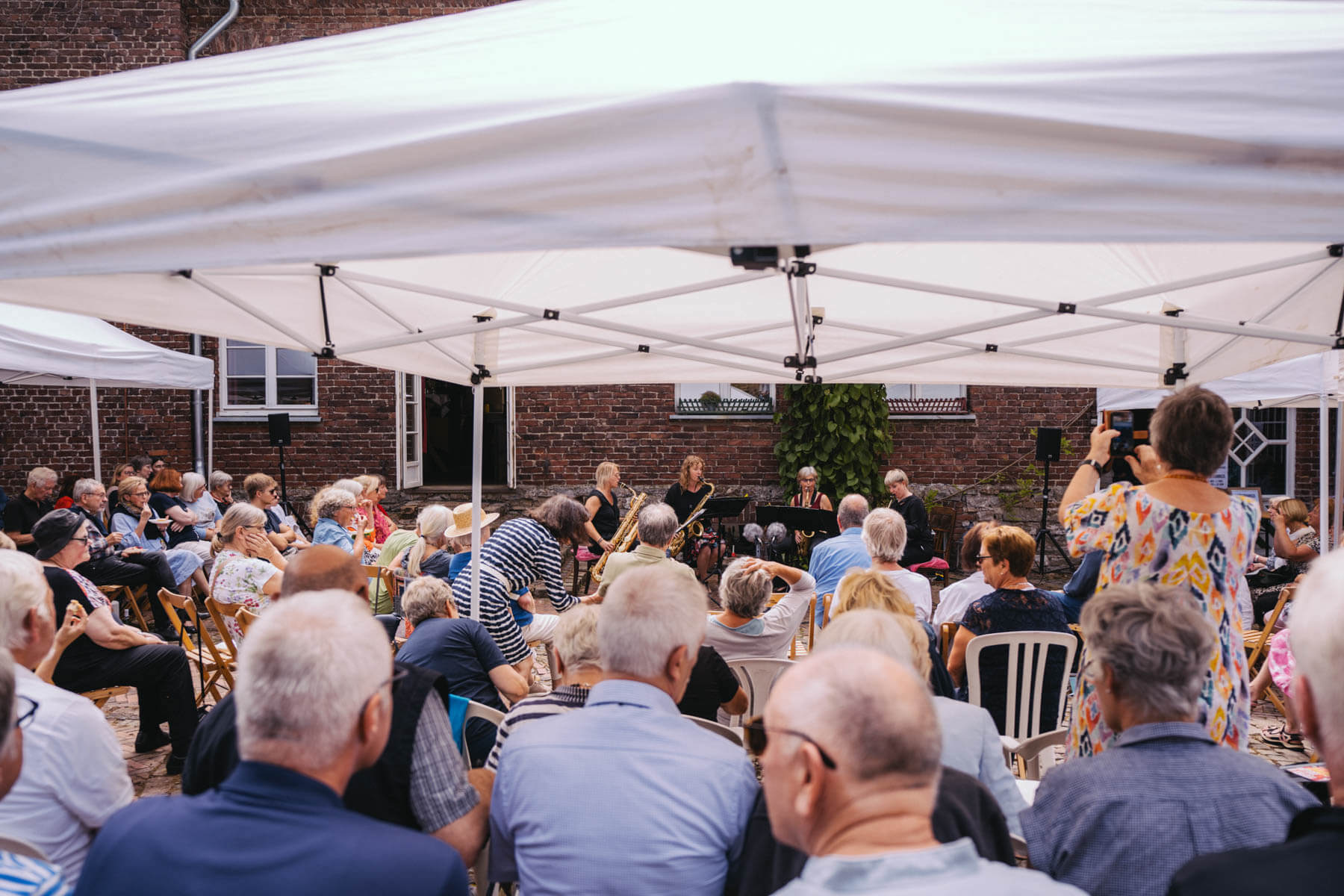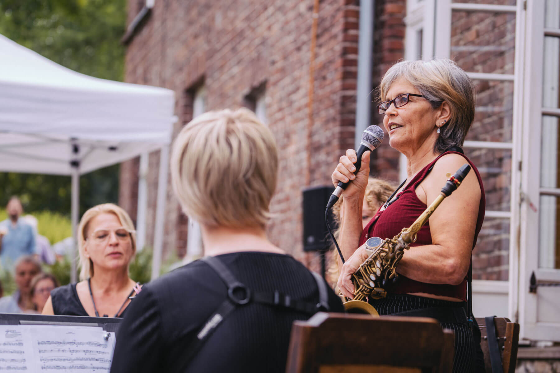 Tatsächlich hatten wir erst einmal ein reines Bläser-Ensemble zu Gast (2022, das Solano Sextett der Duisburger Philharmoniker) und dementsprechend freuten wir uns besonders auf das Lilith Saxophon Quartett, welches das zweite Konzert diesen Jahres spielte. Vier Musikerinnen vom Feinsten spielten ein buntes Programm von Klassik bis Jazz für rund 250 Besucher:innen. Das Wetter war toll, die Musik erst recht und der Garten von Familie Schulte-Illingheim haute uns alle um: Durch die Deele (ein Wort, das nicht alle von uns kannten 😉 ) kommt man in eine Art Open-Air Auditorium inmitten eines wunderschönen, weitläufigen Gartens – als wäre dieser Garten eigens für uns angelegt worden.