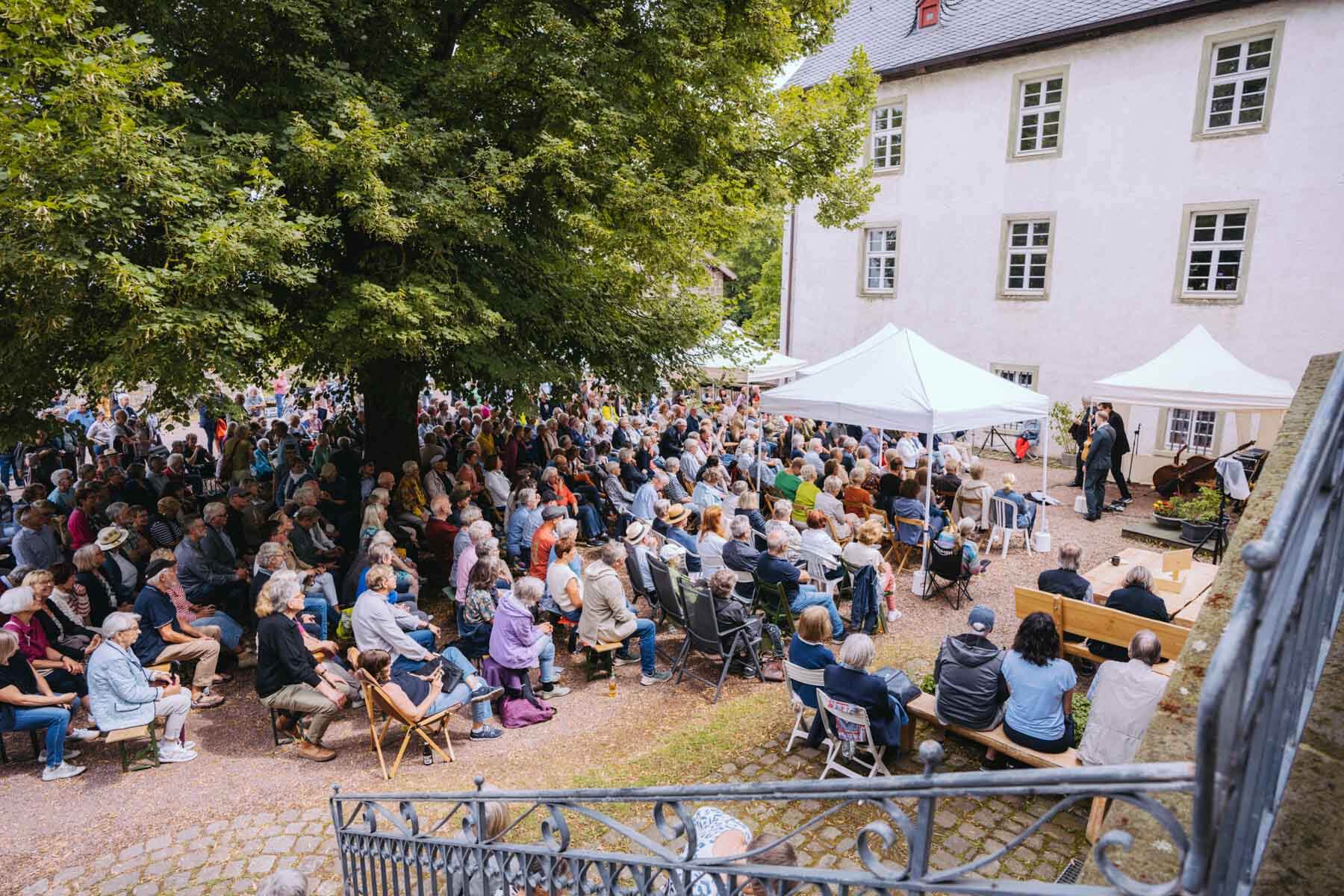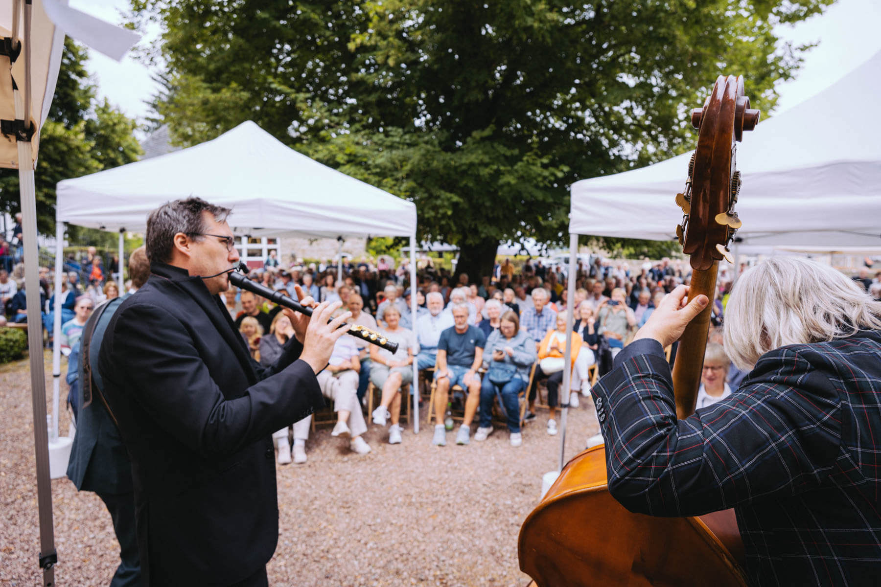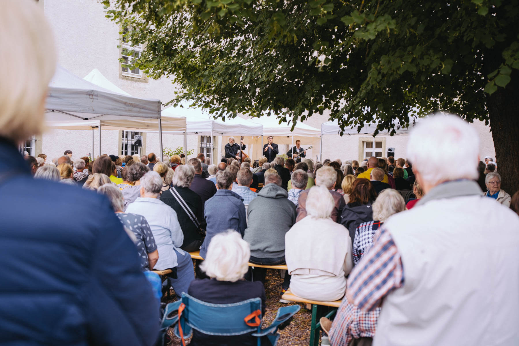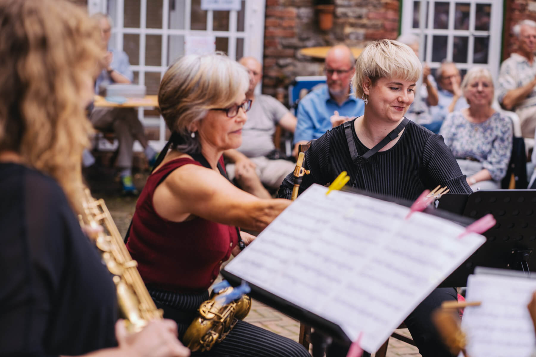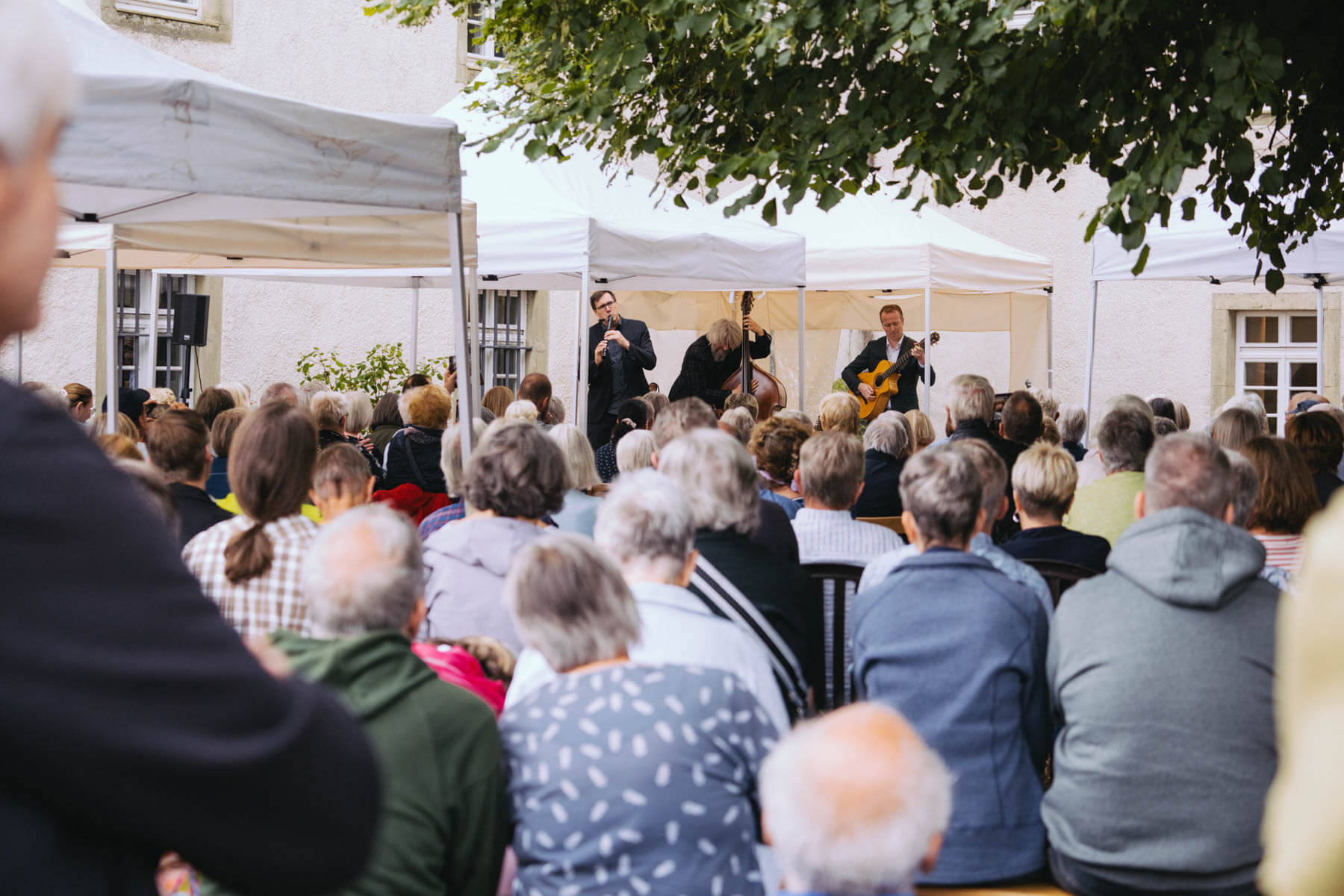 Tatsächlich hatten wir erst einmal ein reines Bläser-Ensemble zu Gast (2022, das Solano Sextett der Duisburger Philharmoniker) und dementsprechend freuten wir uns besonders auf das Lilith Saxophon Quartett, welches das zweite Konzert diesen Jahres spielte. Vier Musikerinnen vom Feinsten spielten ein buntes Programm von Klassik bis Jazz für rund 250 Besucher:innen. Das Wetter war toll, die Musik erst recht und der Garten von Familie Schulte-Illingheim haute uns alle um: Durch die Deele (ein Wort, das nicht alle von uns kannten 😉 ) kommt man in eine Art Open-Air Auditorium inmitten eines wunderschönen, weitläufigen Gartens – als wäre dieser Garten eigens für uns angelegt worden.