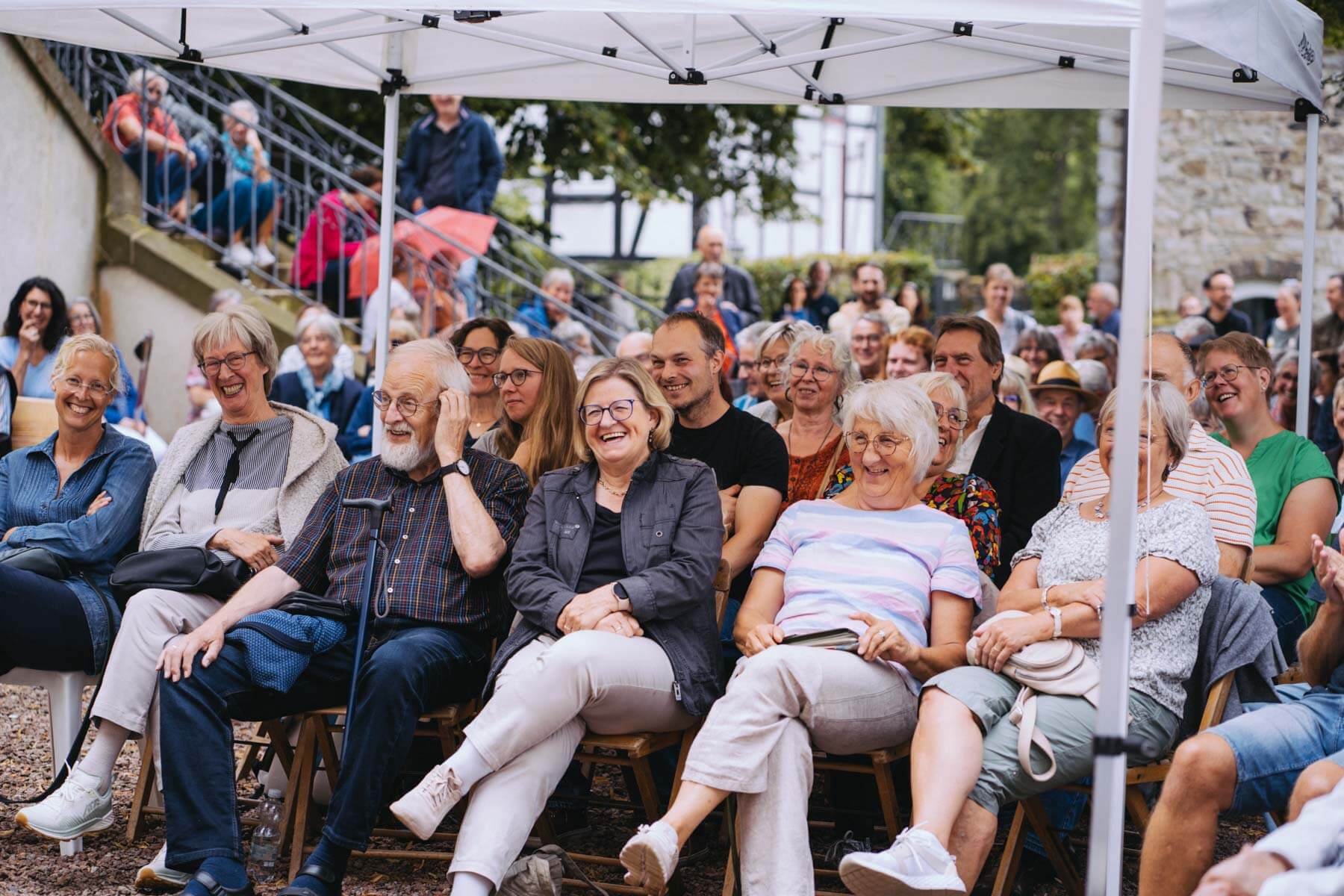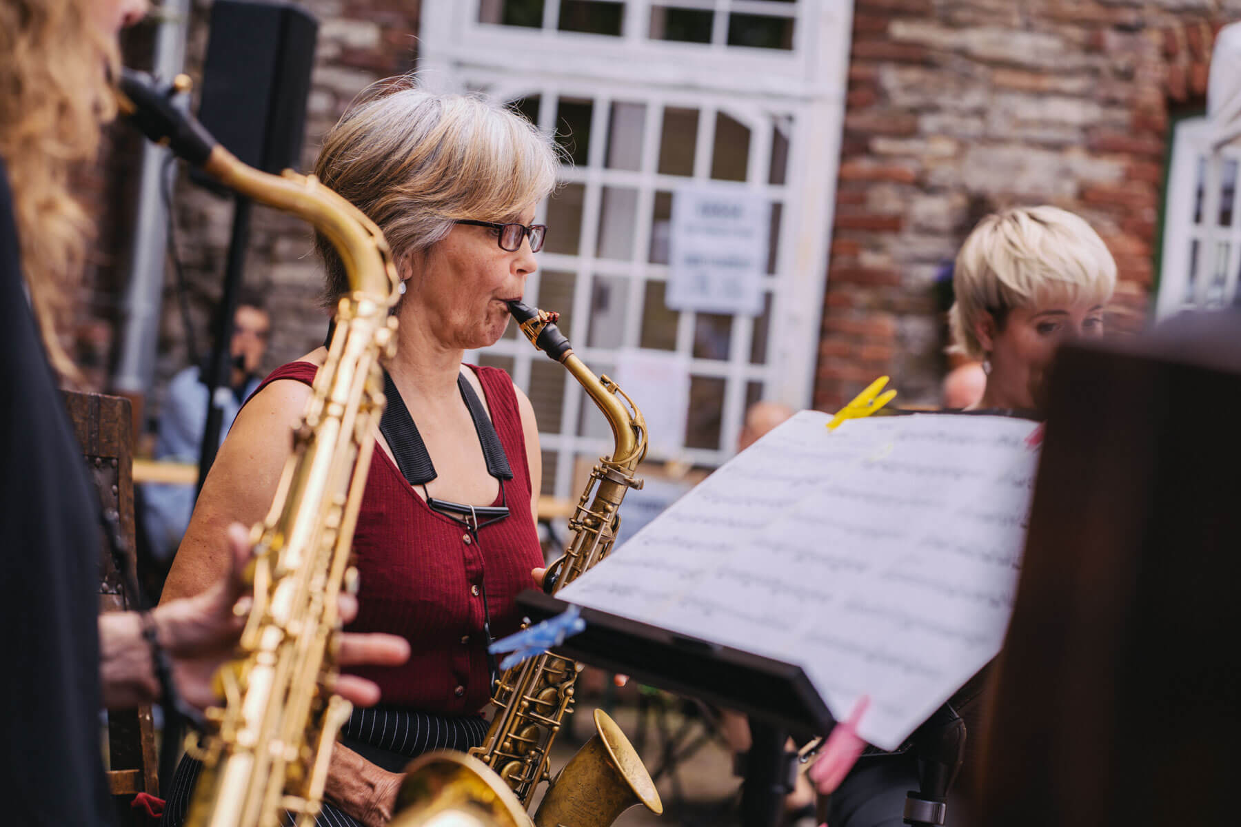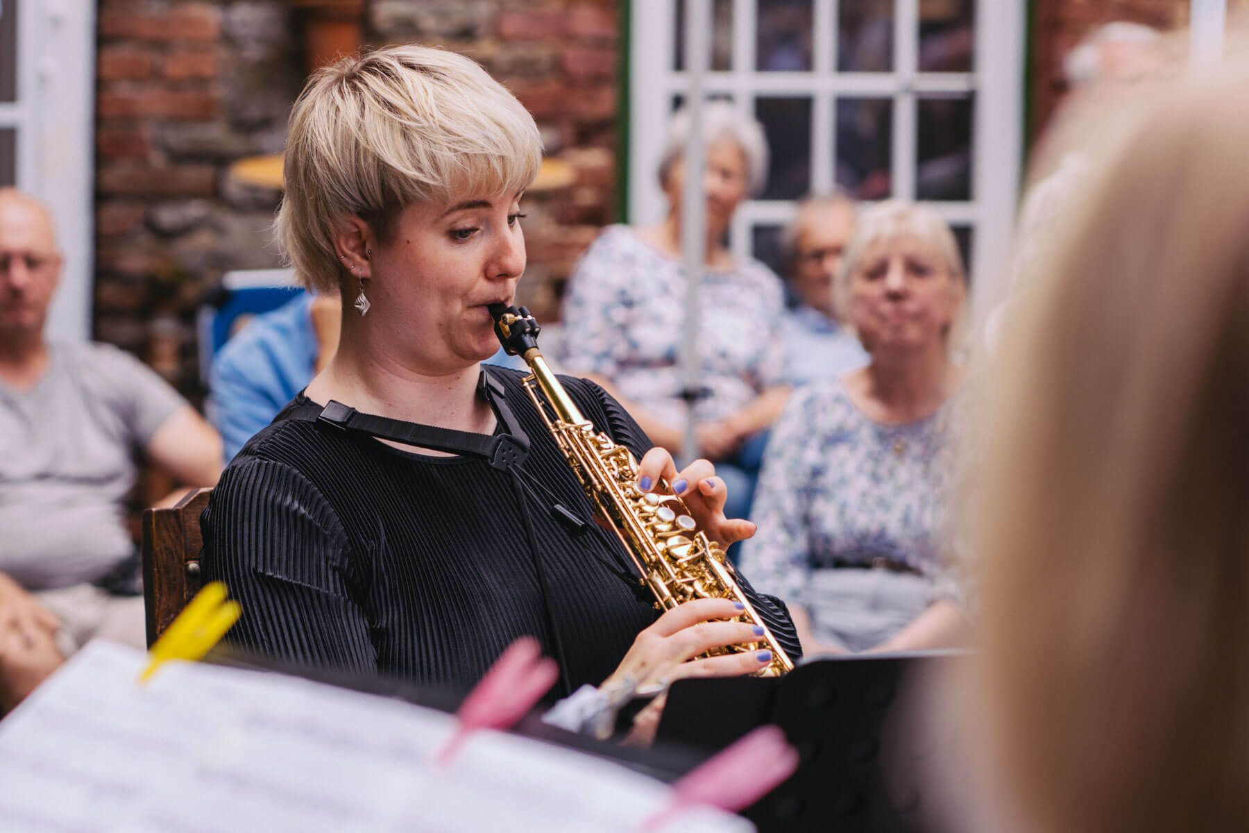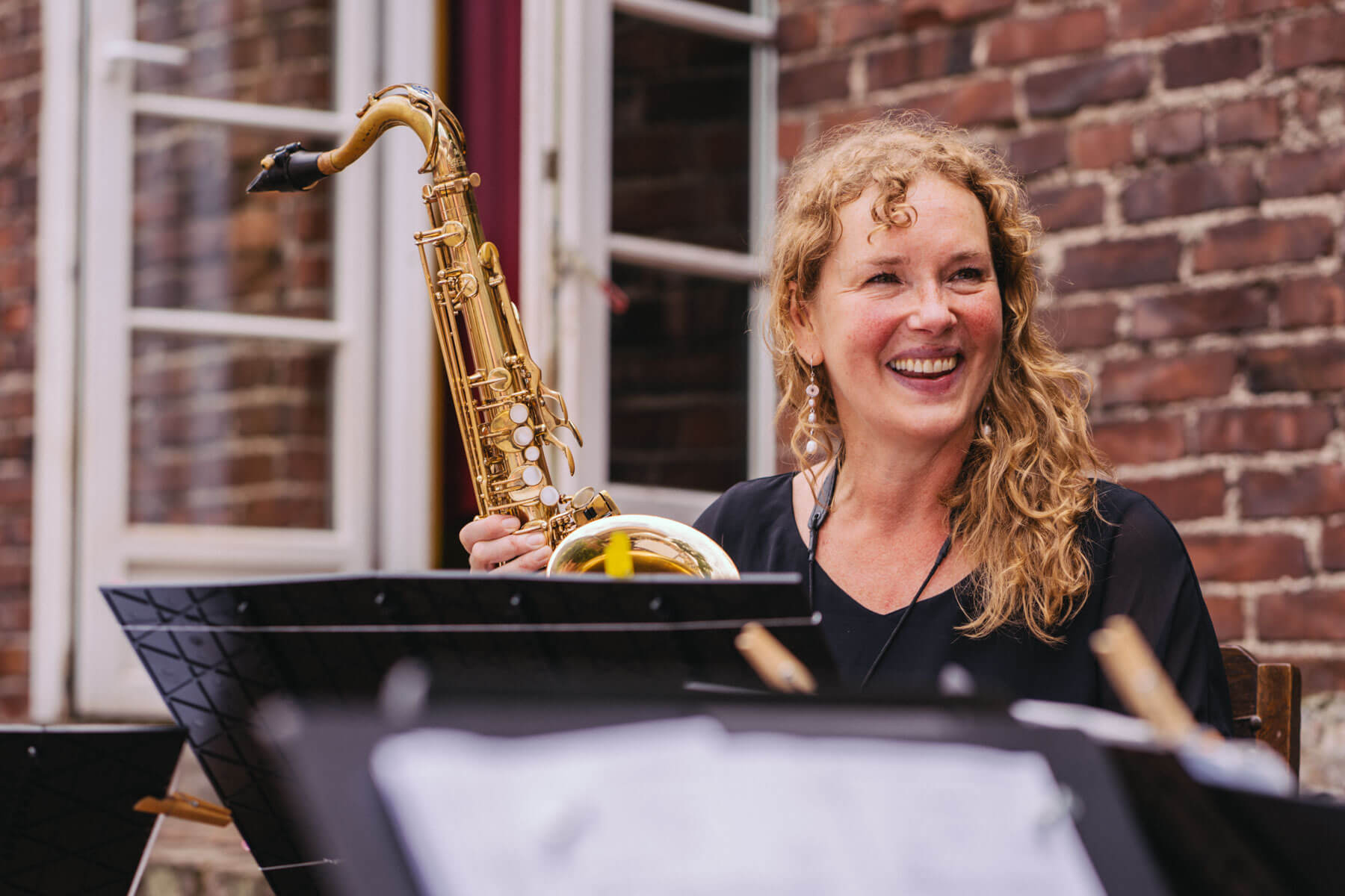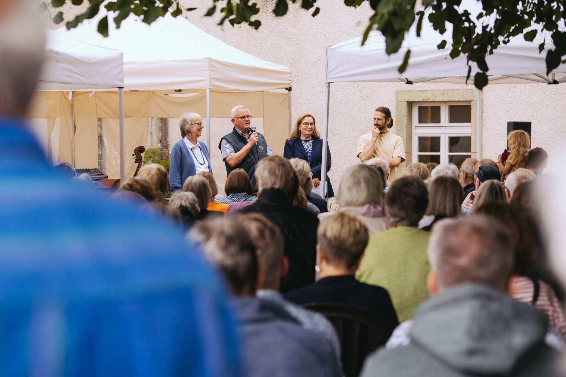 Tatsächlich hatten wir erst einmal ein reines Bläser-Ensemble zu Gast (2022, das Solano Sextett der Duisburger Philharmoniker) und dementsprechend freuten wir uns besonders auf das Lilith Saxophon Quartett, welches das zweite Konzert diesen Jahres spielte. Vier Musikerinnen vom Feinsten spielten ein buntes Programm von Klassik bis Jazz für rund 250 Besucher:innen. Das Wetter war toll, die Musik erst recht und der Garten von Familie Schulte-Illingheim haute uns alle um: Durch die Deele (ein Wort, das nicht alle von uns kannten 😉 ) kommt man in eine Art Open-Air Auditorium inmitten eines wunderschönen, weitläufigen Gartens – als wäre dieser Garten eigens für uns angelegt worden.
